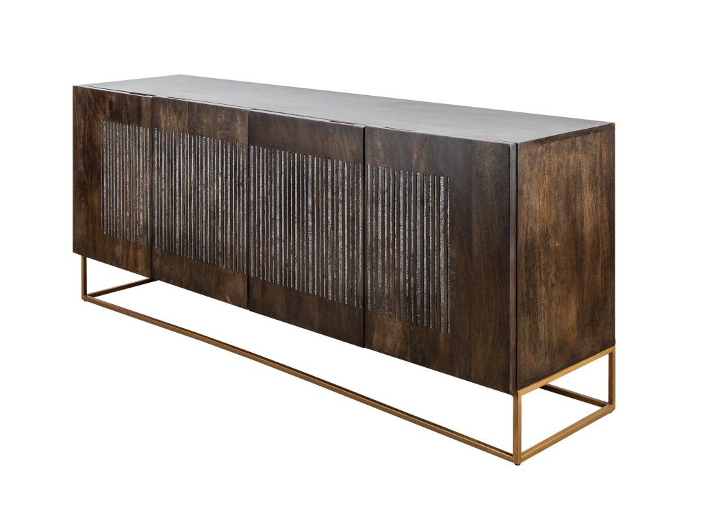 Designová komoda z masivu v tmavém provedení s lamelovým dekorem a zlatou podnoží