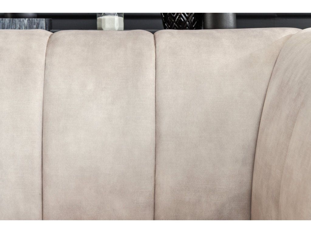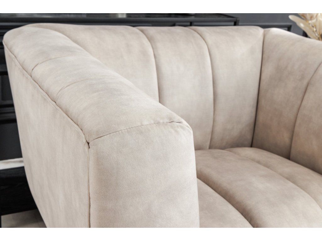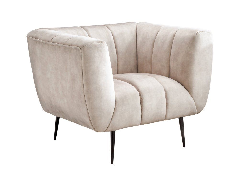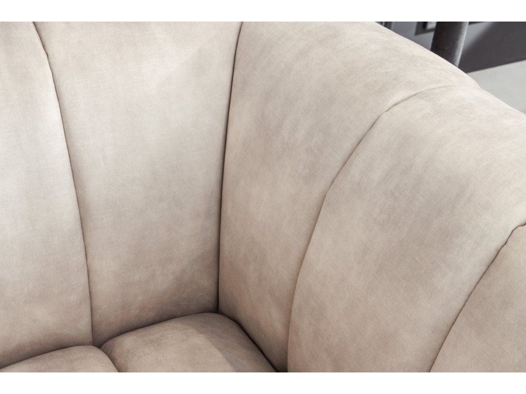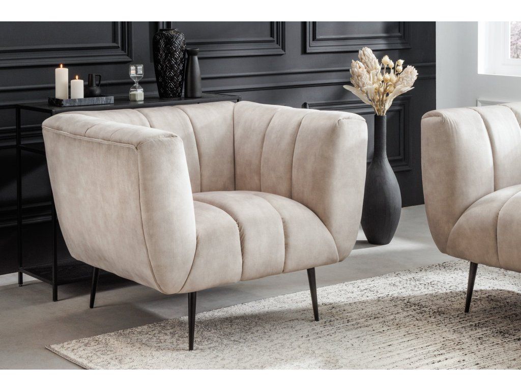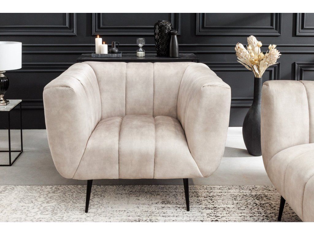 Moderní designové křeslo v béžovém odstínu zaujme svým oblým tvarem a výrazným vertikálním prošíváním, které dodává celému křeslu elegantní a nadčasový vzhled. Díky kombinaci měkkých linií a subtilních nohou působí křeslo lehce a vzdušně.