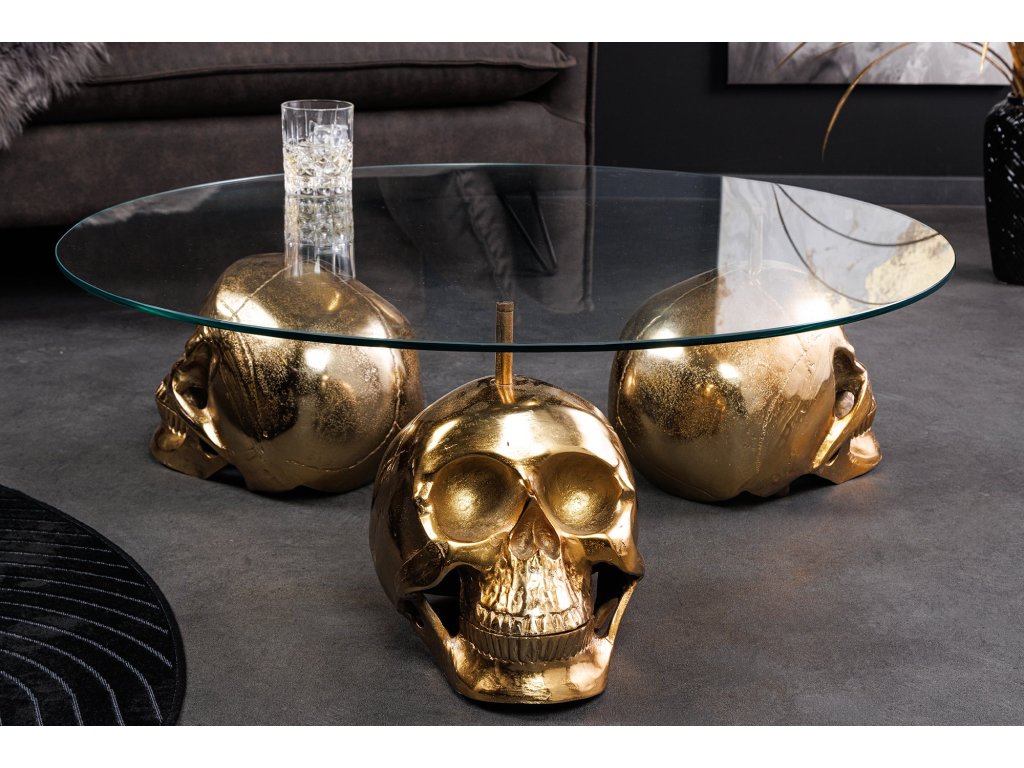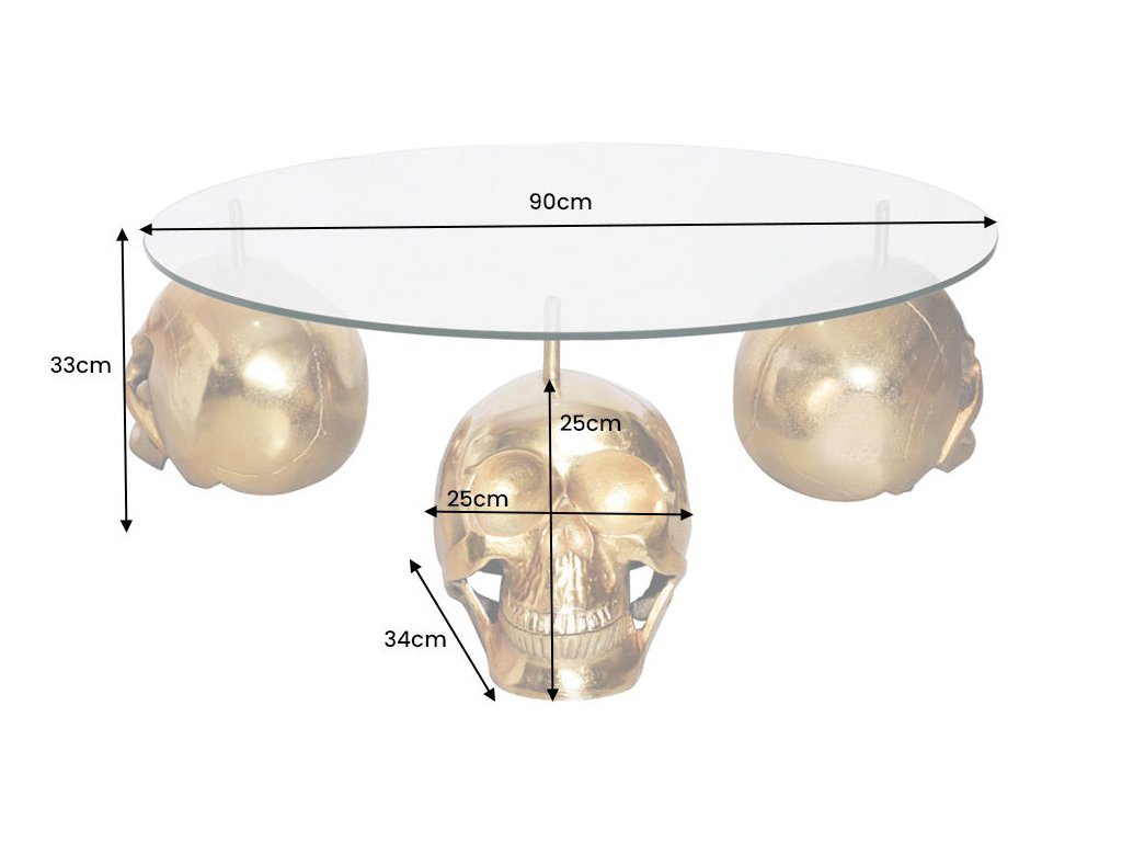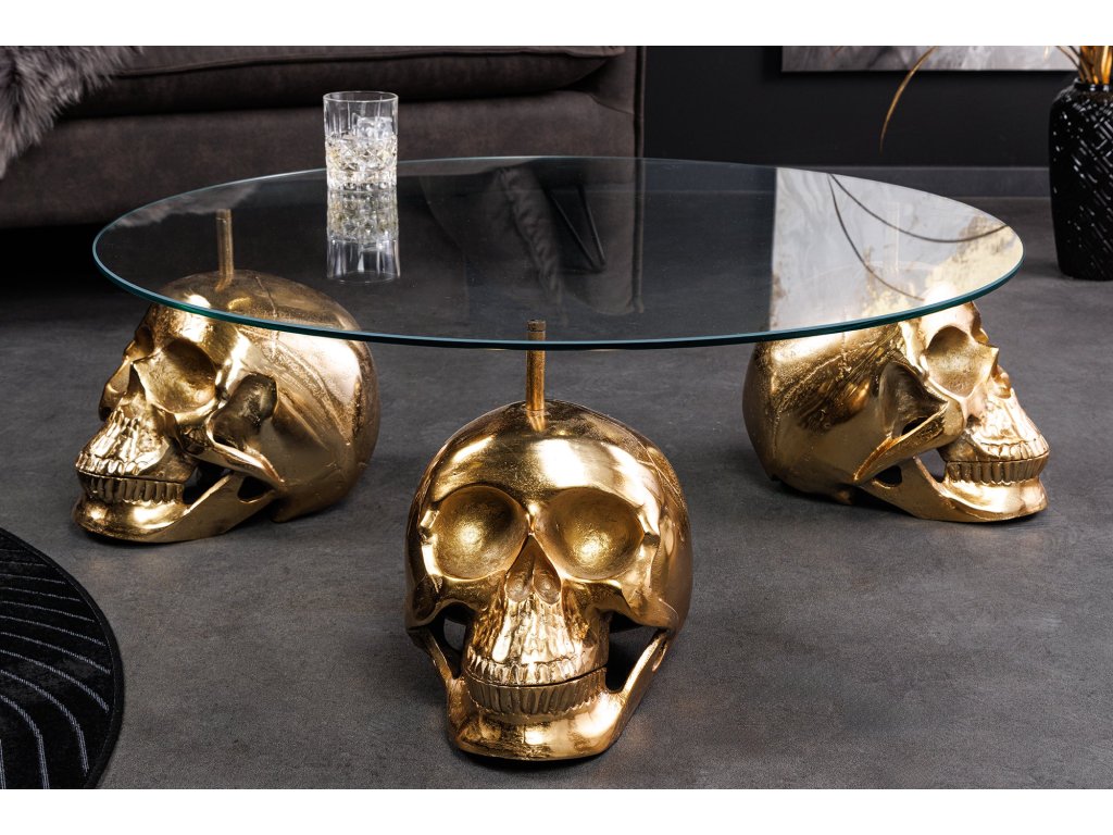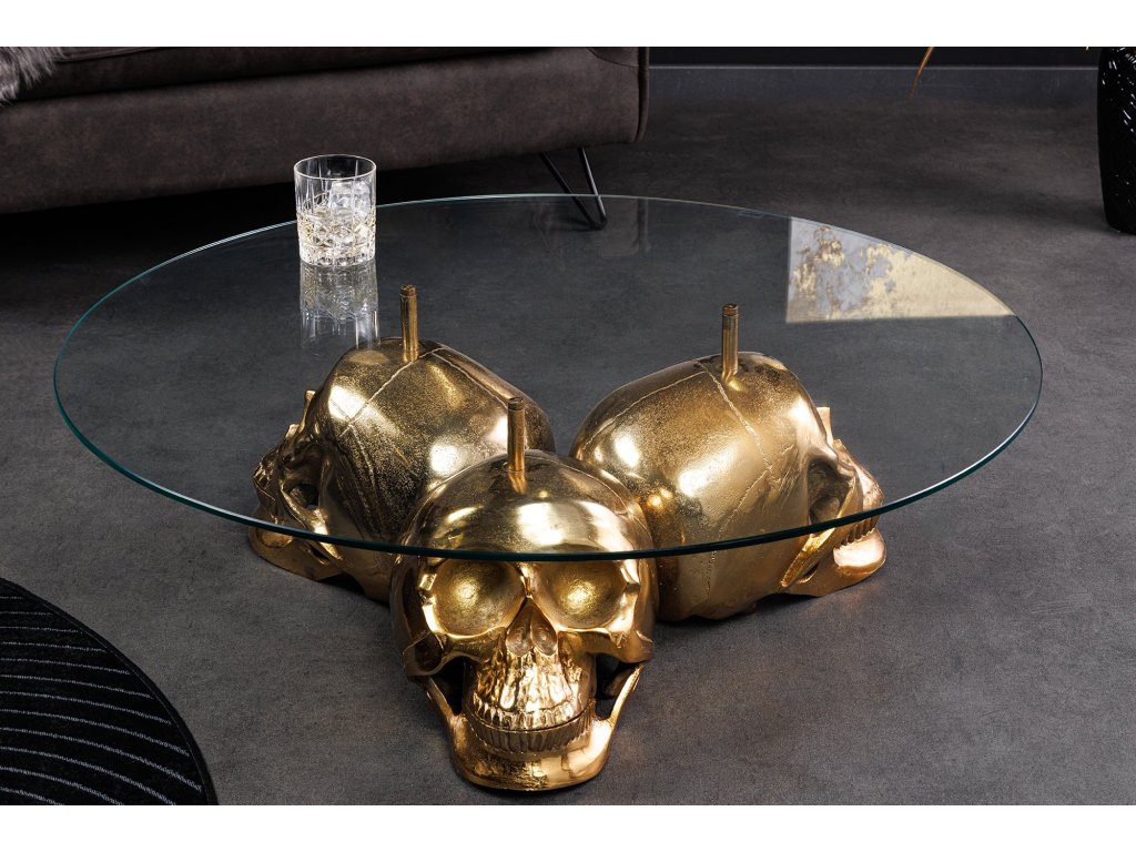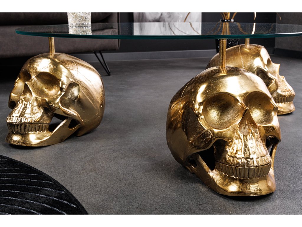 Konferenční stolek MEMENTO Gold Skull je nepřehlédnutelný solitér určený pro odvážné a osobité interiéry. Čirá skleněná deska působí lehce a elegantně, zatímco masivní podnož v podobě tří zlatých lebek dodává stolu dramatický charakter a luxusní nádech.