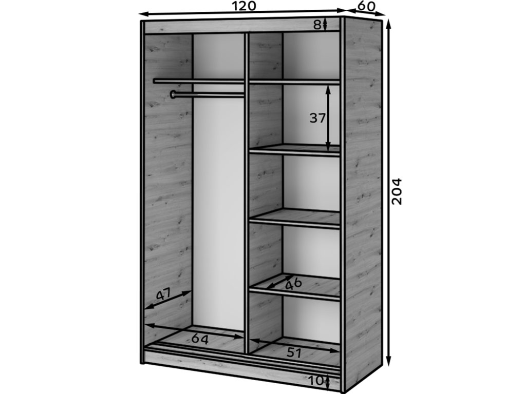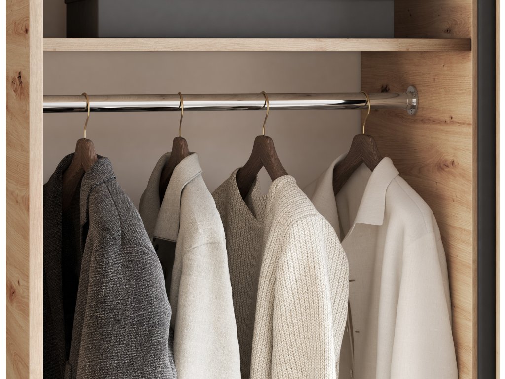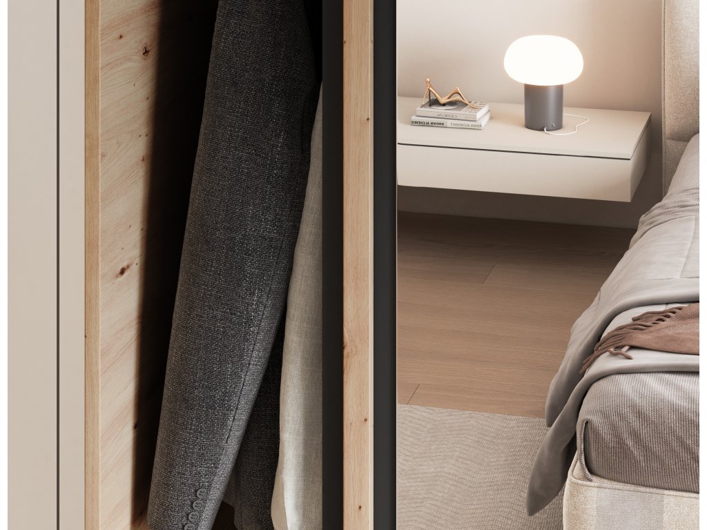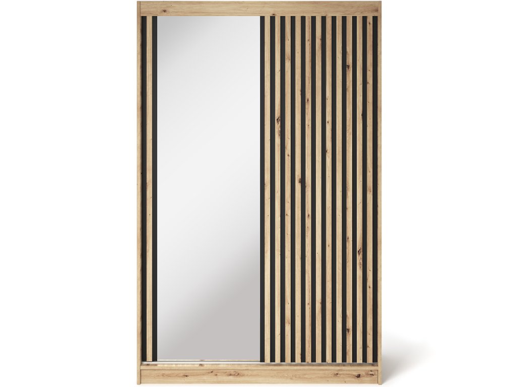 Posuvná skříň se zrcadlem Emerio II o rozměrech 120x204x60 cm je funkční a moderní kus nábytku ideální do ložnice, předsíně nebo šatny. Je vyrobena z odolné laminované dřevotřísky v dekoru dub artisan, s estetickým zakončením čelní strany v podobě odolné ABS hrany. Skříň je vybavena dvěma posuvnými dveřmi se zrcadlem a moderním mechanismem Laguna Fast, který zajišťuje plynulý a tichý provoz. Uvnitř se nachází praktická tyč na ramínka a celek doplňuje černý plastový kluzák – skříň Emerio II tak spojuje styl, odolnost a každodenní pohodlí.Doplňkové parametry