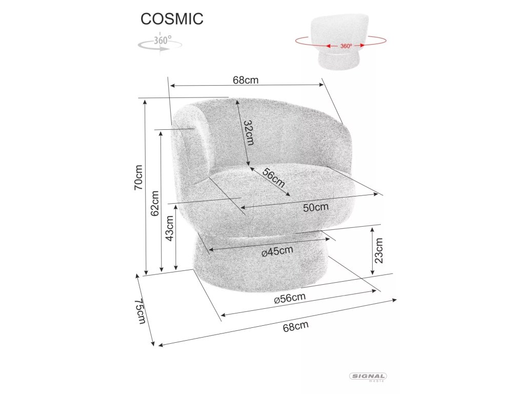Rozměry křesla: A - 70, B - 68, C - 43, D - 56, E - 75, F - 23 cm