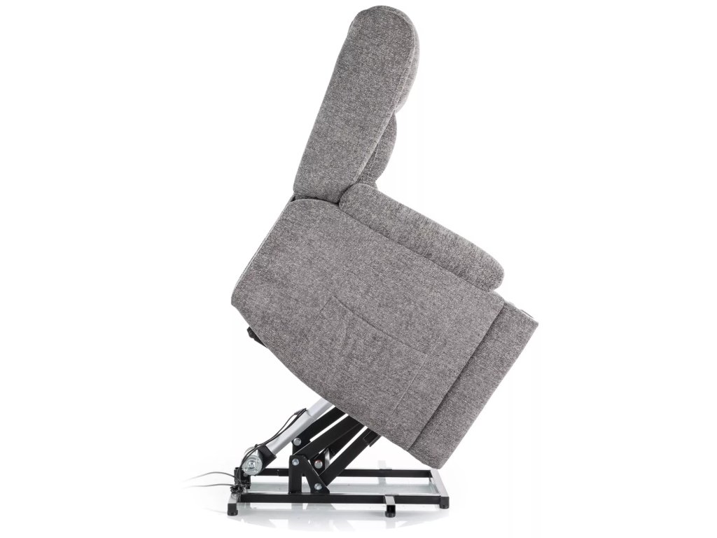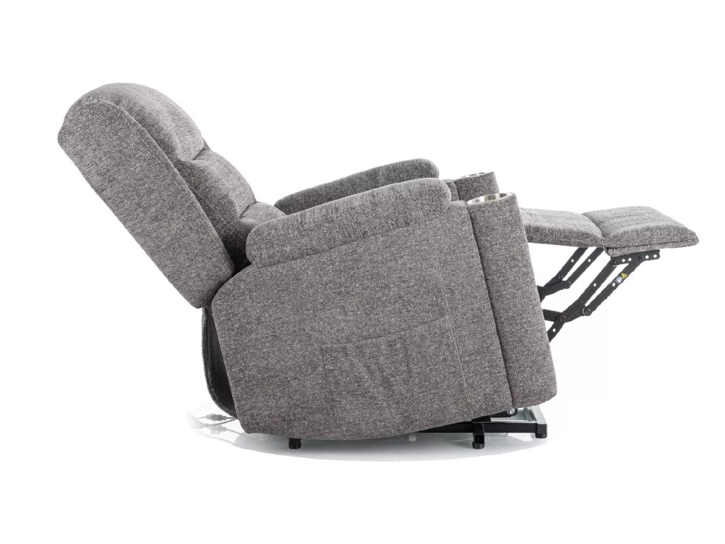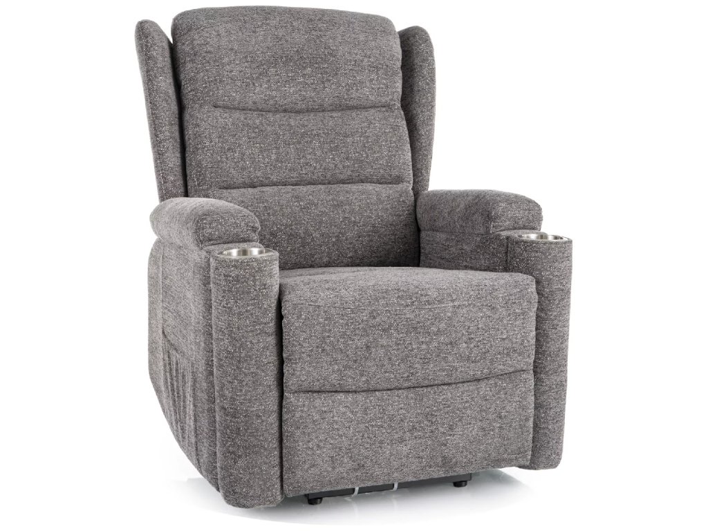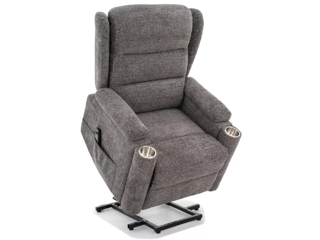 Elektricky polohovací vzpřímená židle, látka Raven 13, kovová konstrukce, barva: šedá / černá. Držák na nápoje, praktická kapsa na pravé straně, kabelové dálkové ovládání.