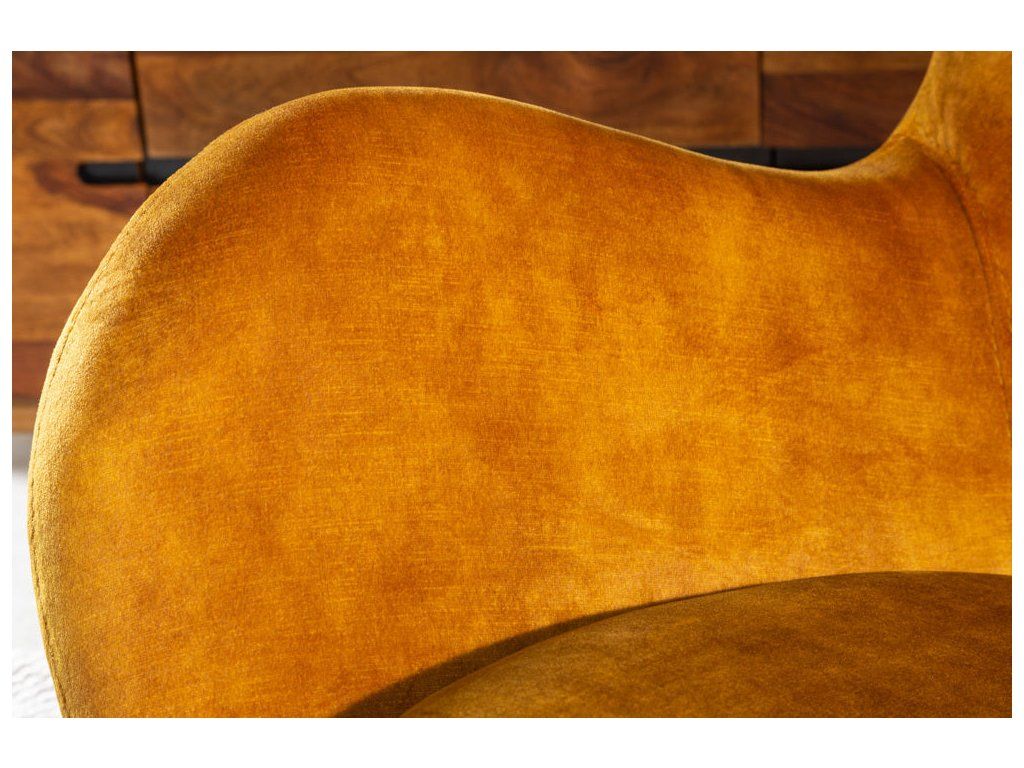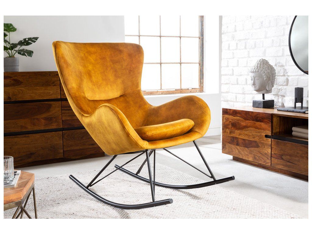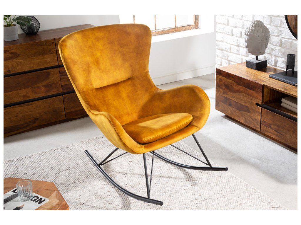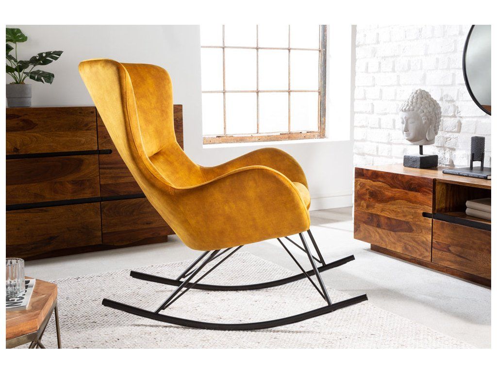 Designové houpací křeslo v výrazném hořčicovém odstínu zaujme svým elegantním tvarem a vysokým opěradlem, které poskytuje příjemnou oporu při sezení. Díky svému modernímu vzhledu se stane nepřehlédnutelným prvkem každého interiéru.