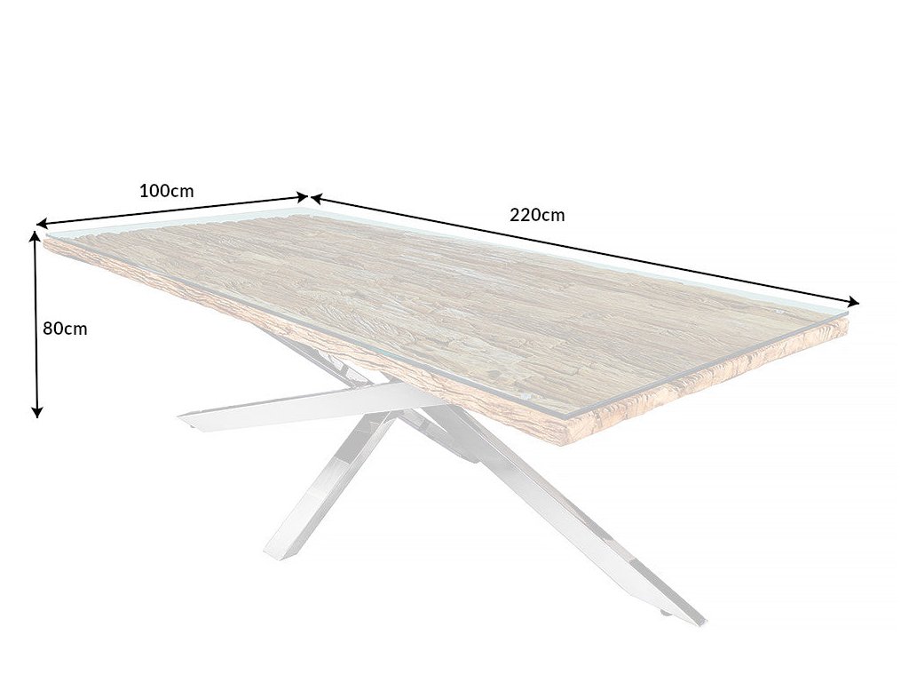 Jídelní stůl BARRACUDA (220 cm) představuje dokonalé spojení přírodních a moderních materiálů. Horní deska je vyrobena z masivního teakového dřeva, které je známé svou pevností, přirozenou texturou a teplým odstínem. Povrch je doplněn o vrstvu tvrzeného skla, která zvýrazňuje jedinečnou strukturu dřeva a zároveň ho chrání před poškozením. Stabilní chromovaná ocelová konstrukce dodává stolu exkluzivní lesk a maximální stabilitu. Díky své délce je ideální pro prostorné jídelny či reprezentativní prostory, kde se stane nepřehlédnutelným dominantním prvkem.