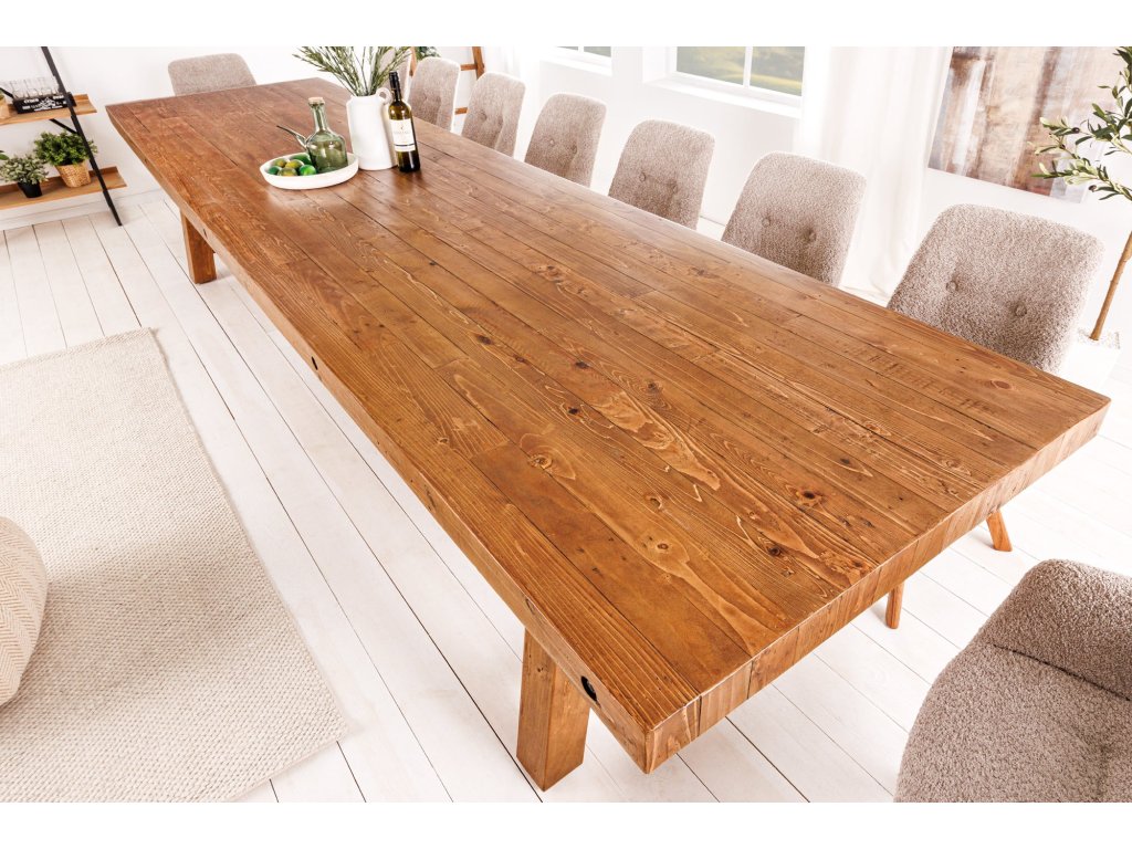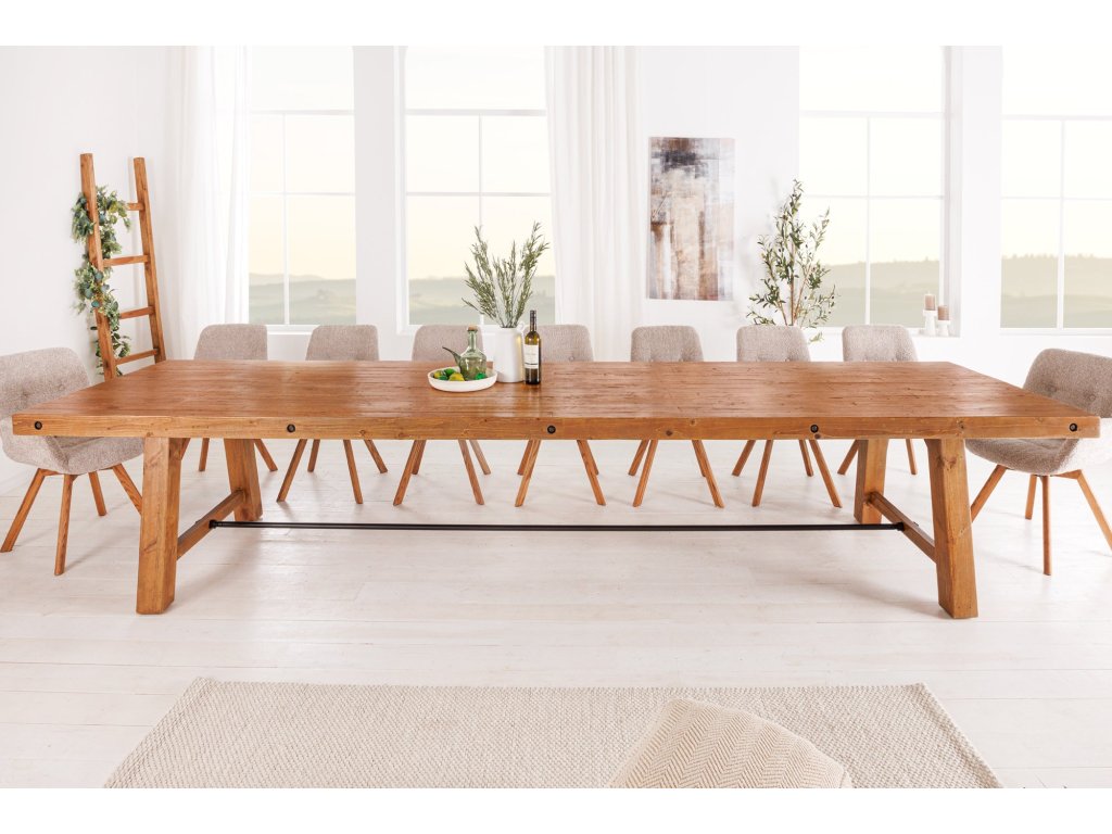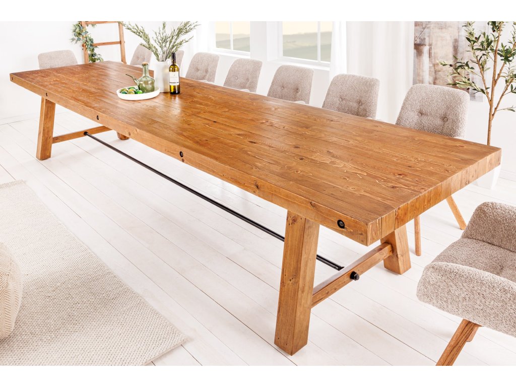 Masivní jídelní stůl FINCA 300 cm představuje spojení přírodního dřeva, poctivého zpracování a industriálního charakteru. Deska z borovicového masivu má tloušťku 8 cm, která zvýrazňuje pevnost a robustní vzhled.