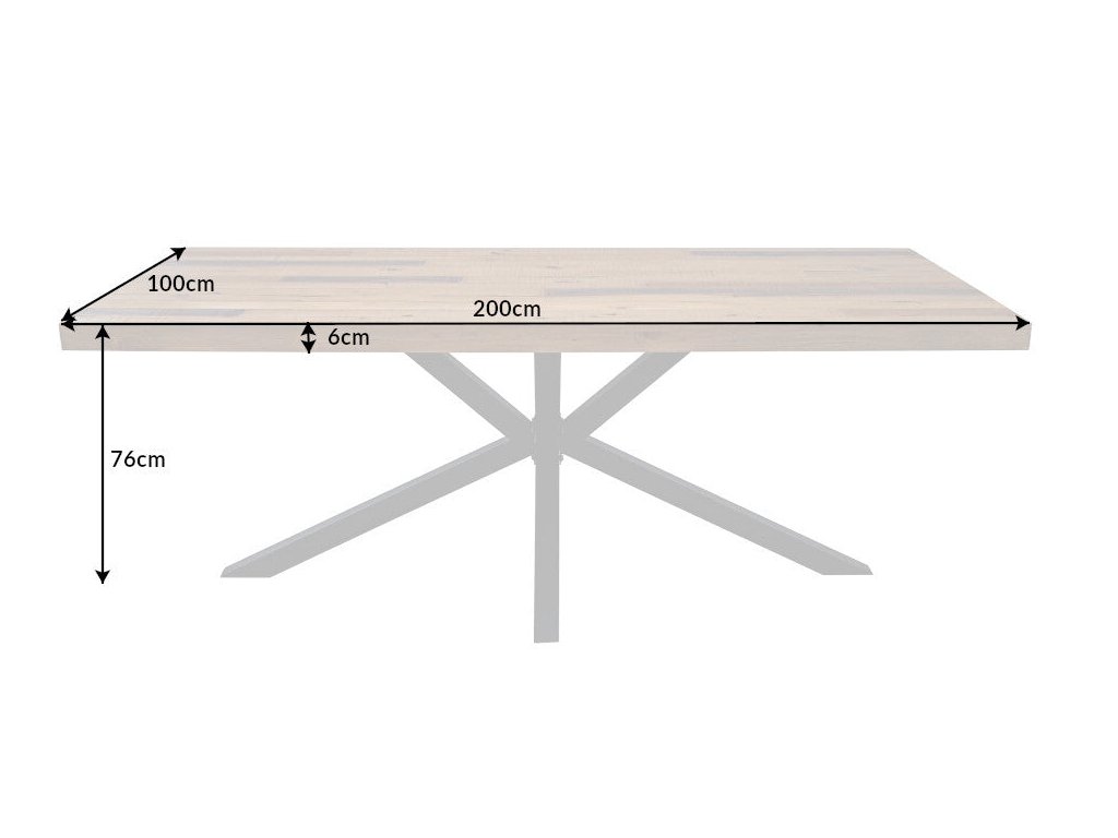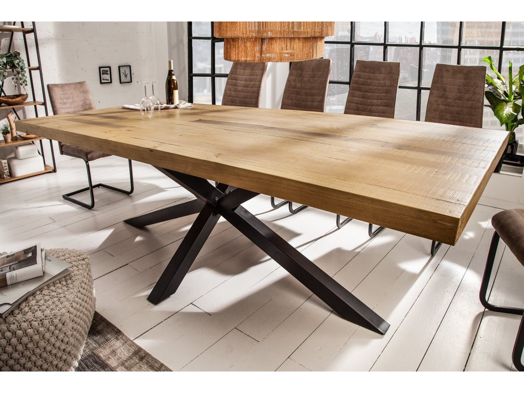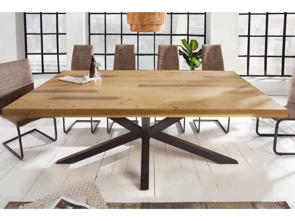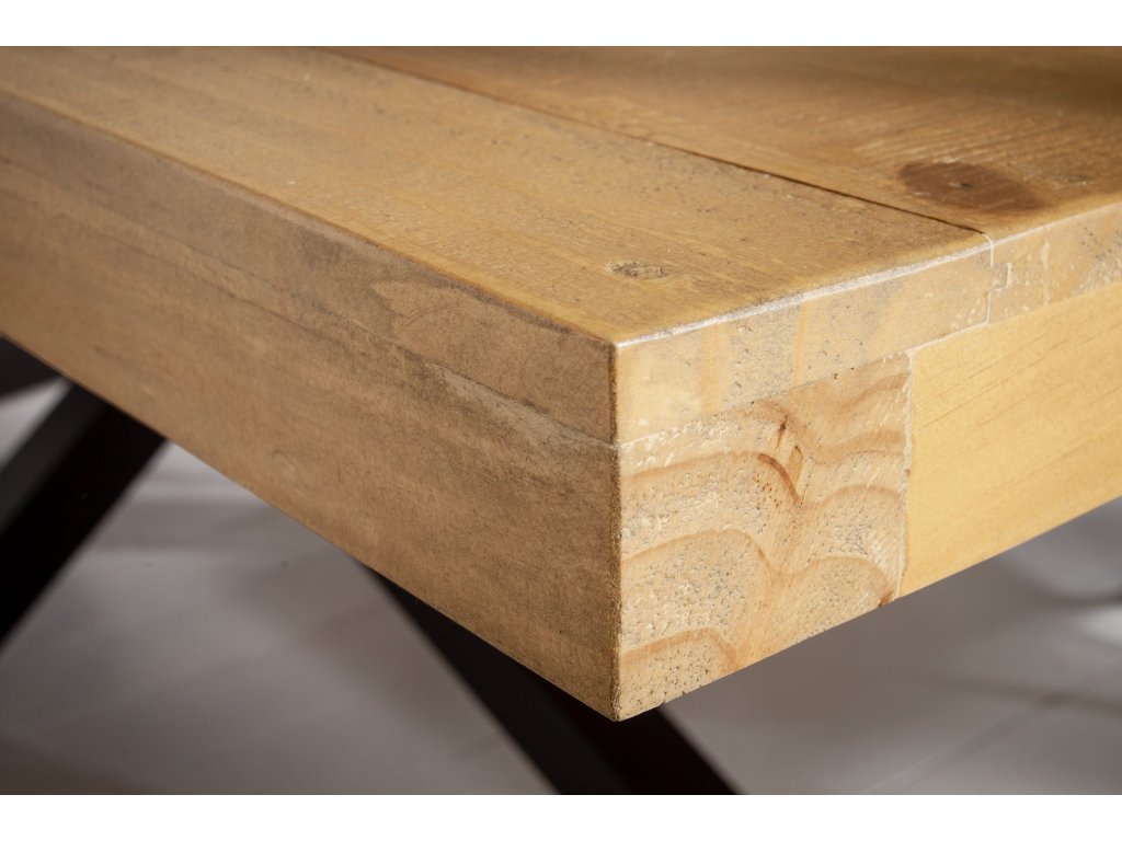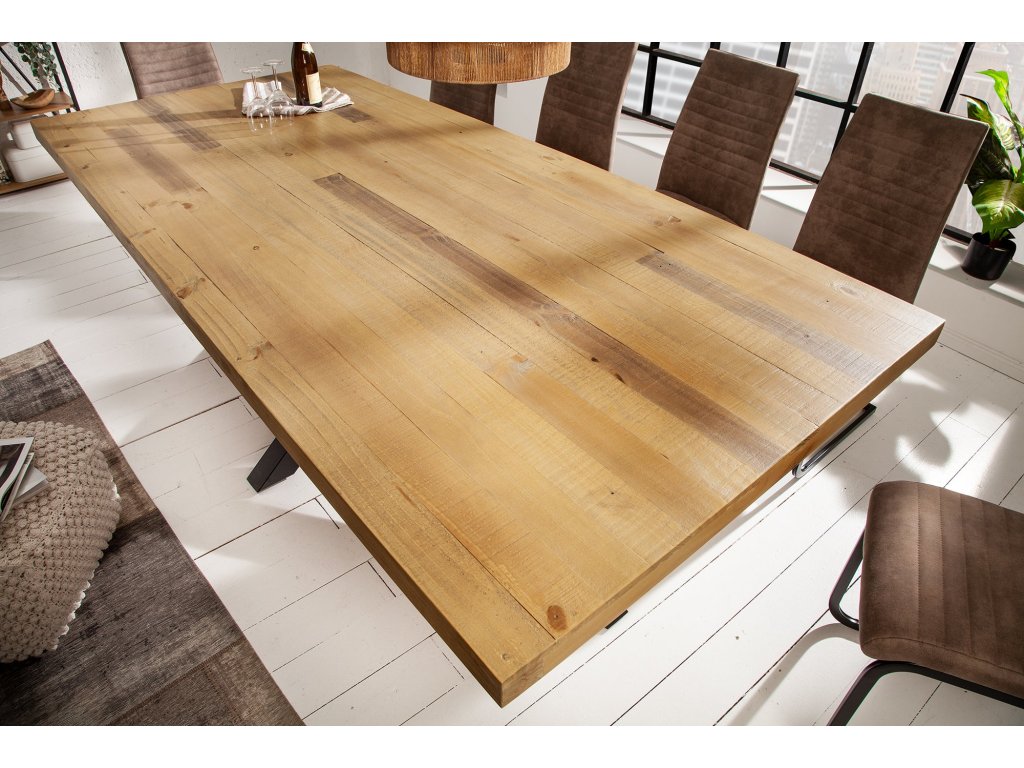 Masivní jídelní stůl GALAXIE 200 cm je důkazem, že kombinace přírodního dřeva a kovu nikdy neztratí na síle. Deska z kvalitního borovicového masivu o tloušťce 6 cm vyniká ručním opracováním a originální kresbou dřeva s jemnou patinou.