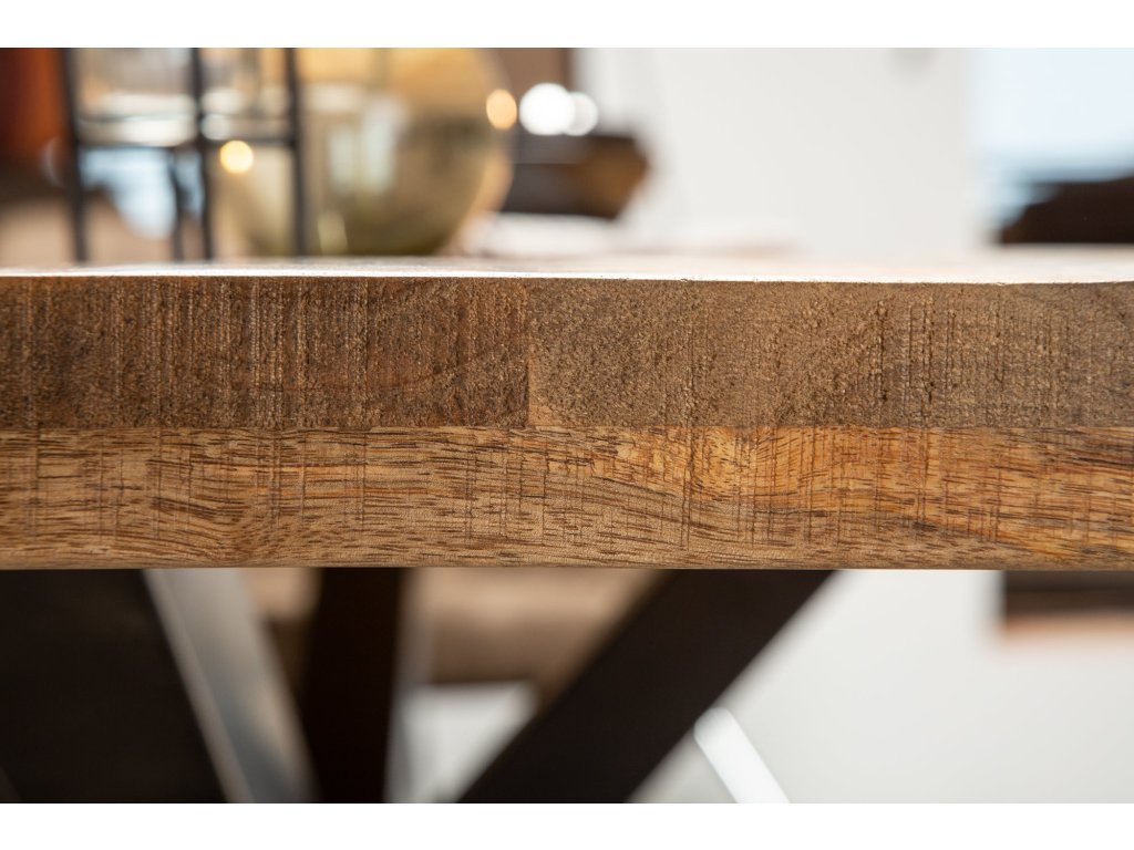 Masivní jídelní stůl GALAXIE 200 cm spojuje přírodní krásu exotického mangového dřeva s pevnou kovovou konstrukcí. Deska o tloušťce 5,5 cm je ručně opracována, aby vynikla přirozená kresba dřeva, díky níž je každý kus originál.
