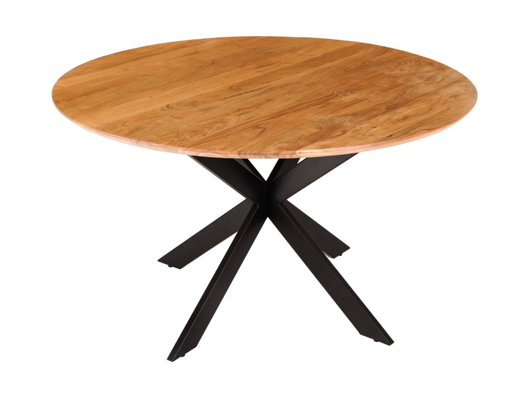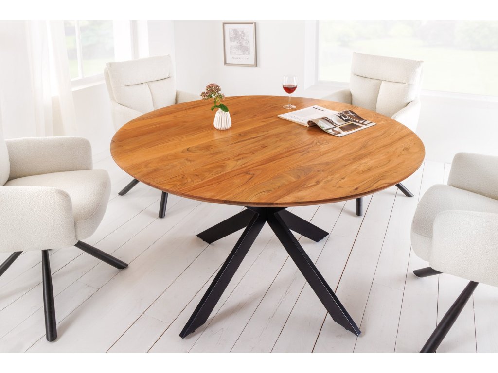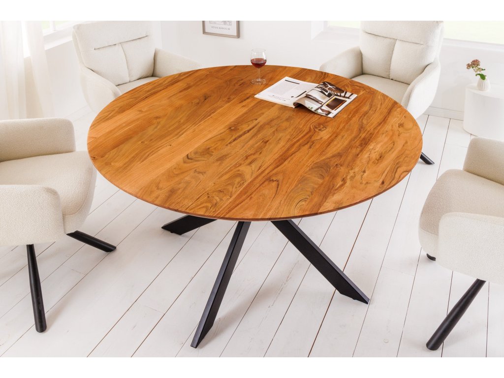 Masivní dřevěný jídelní stůl GALAXIE – akát / černá kovová podnož / Ø130 cm