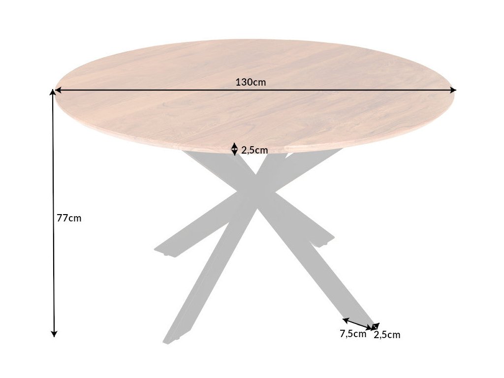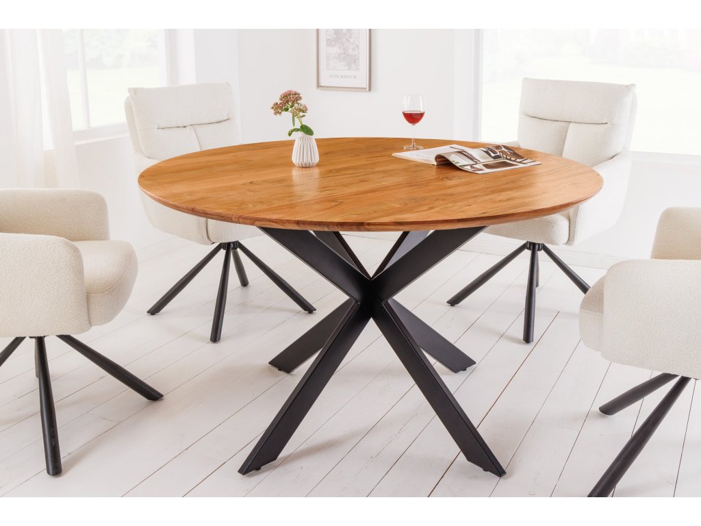Masivní jídelní stůl GALAXIE Ø130 cm spojuje přírodní krásu a pevnost akátového dřeva s moderní industriální estetikou. Jeho kulatá deska o průměru 130 cm a tloušťce 2,5 cm nabízí komfortní prostor pro 4–6 osob.