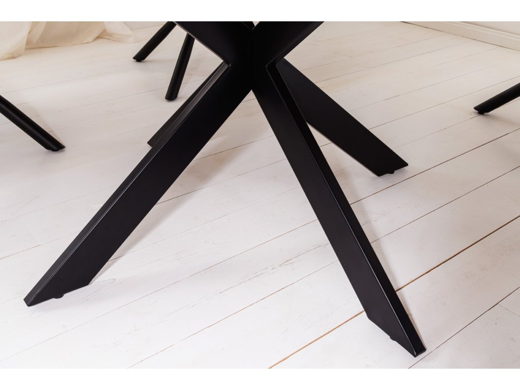 Černá kovová podnož ve tvaru hvězdy dodává stolu stabilitu i designový charakter. Povrch desky v přírodním odstínu zvýrazňuje strukturu dřeva a vytváří teplý, přirozený dojem. Skvěle se hodí do menších jídelních prostor, kuchyní nebo designových kaváren.