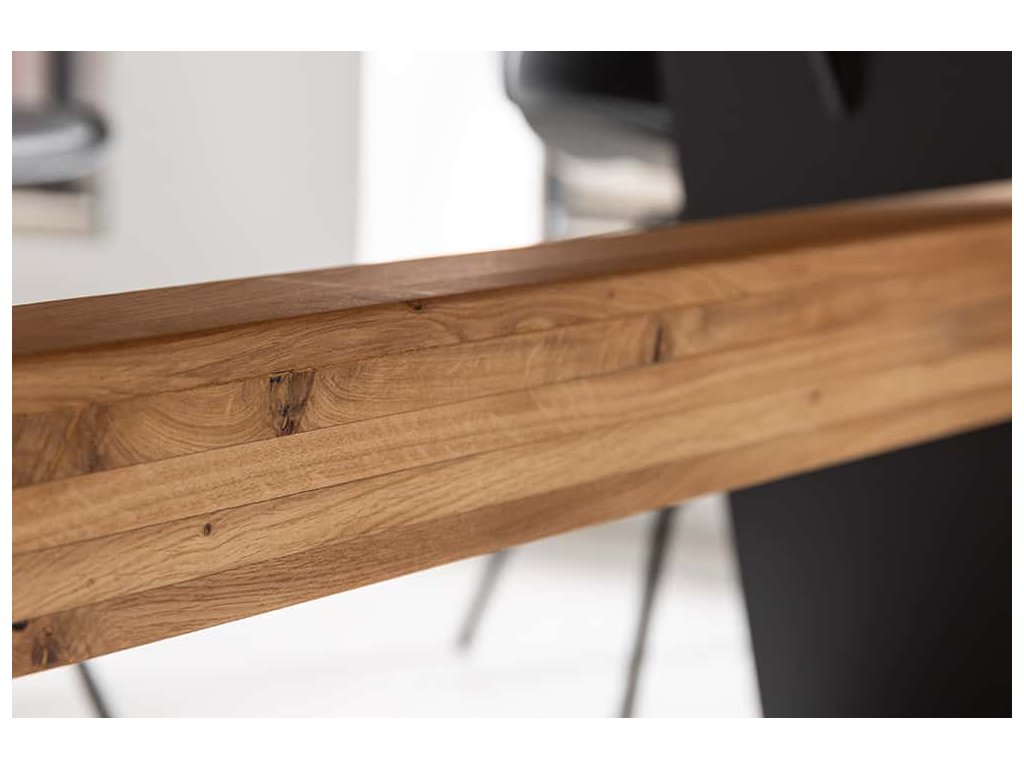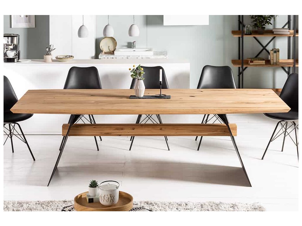 Stůl GRAND OAK je výrazným kusem nábytku, který zaujme svou pevností i vizuální přitažlivostí. Deska z masivního dubového dřeva v přírodním odstínu s přirozenou kresbou působí autenticky a elegantně. Silné ocelové nohy ve tvaru „A“ zajišťují výjimečnou stabilitu a dodávají stolu industriální charakter. Díky délce 200 cm poskytuje prostor pro pohodlné stolování až 10 osob, a stává se tak ideálním centrem každé jídelny či otevřeného interiéru.