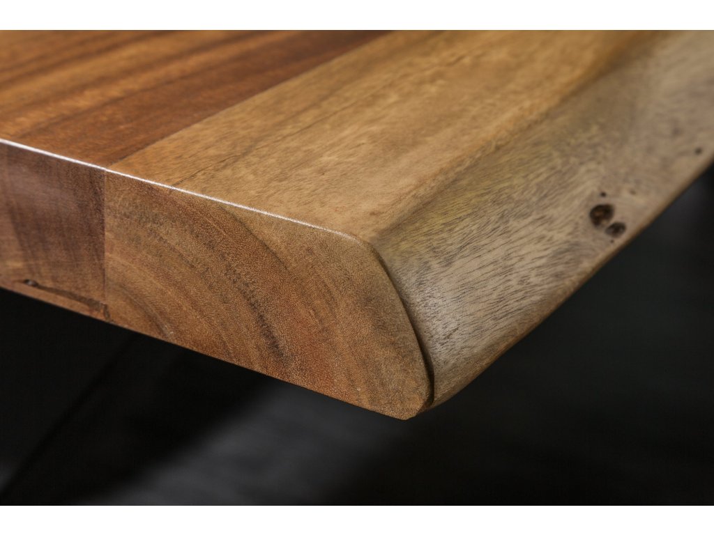 Stůl doplňují robustní X-nohy z černého práškově lakovaného kovu, které zajišťují výjimečnou stabilitu a dodávají nábytku moderní industriální charakter. Povrch dřeva je lakovaný, což chrání před vlhkostí a zároveň zvýrazňuje přírodní kresbu.