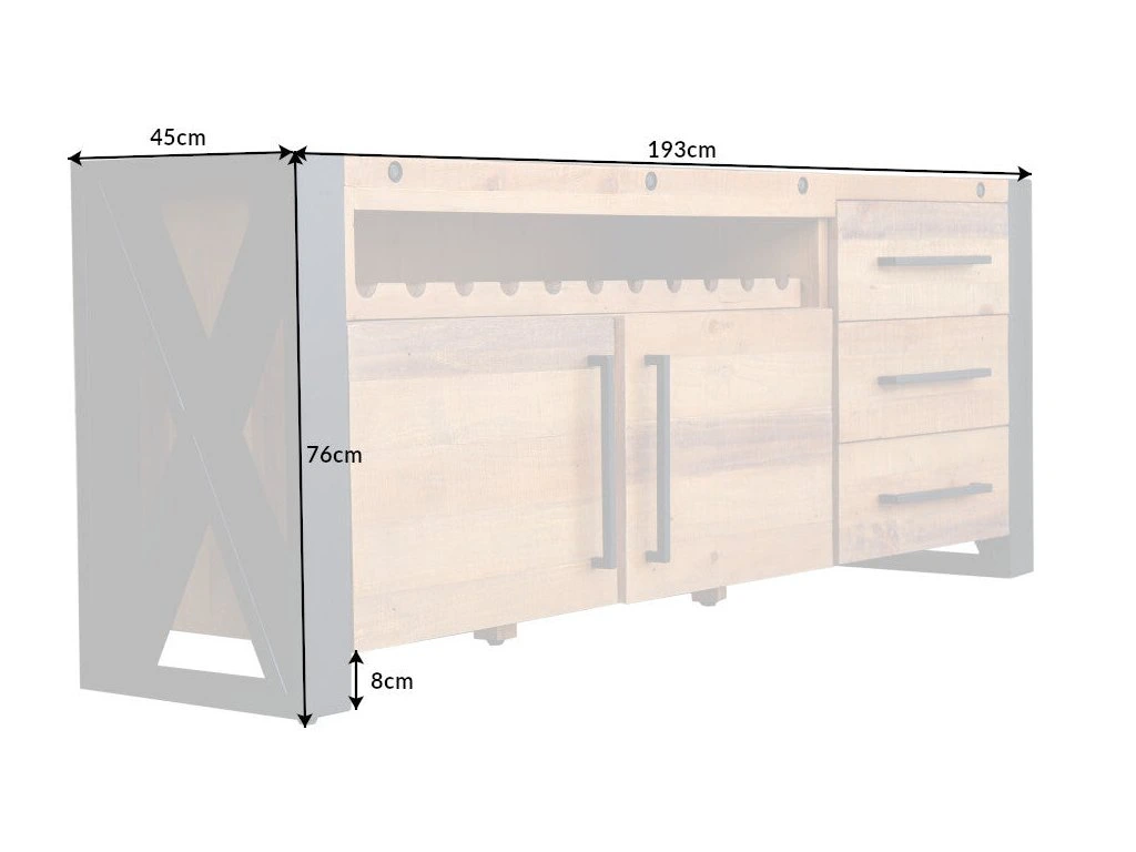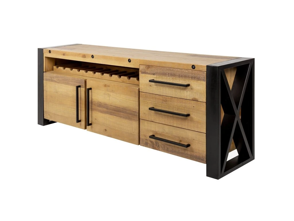 Komoda z masivu s vinotékou, šuplíky a kovovou konstrukcí