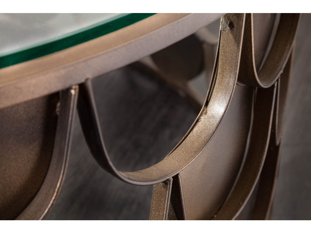 Konferenční stolek kombinuje mosazný kovový rám s deskou z tvrzeného skla, což vytváří moderní a zároveň sofistikovaný vzhled. Originální kruhový design působí jako stylová dominanta obývacího pokoje, zatímco kvalitní materiály zajišťují dlouhou životnost a snadnou údržbu.