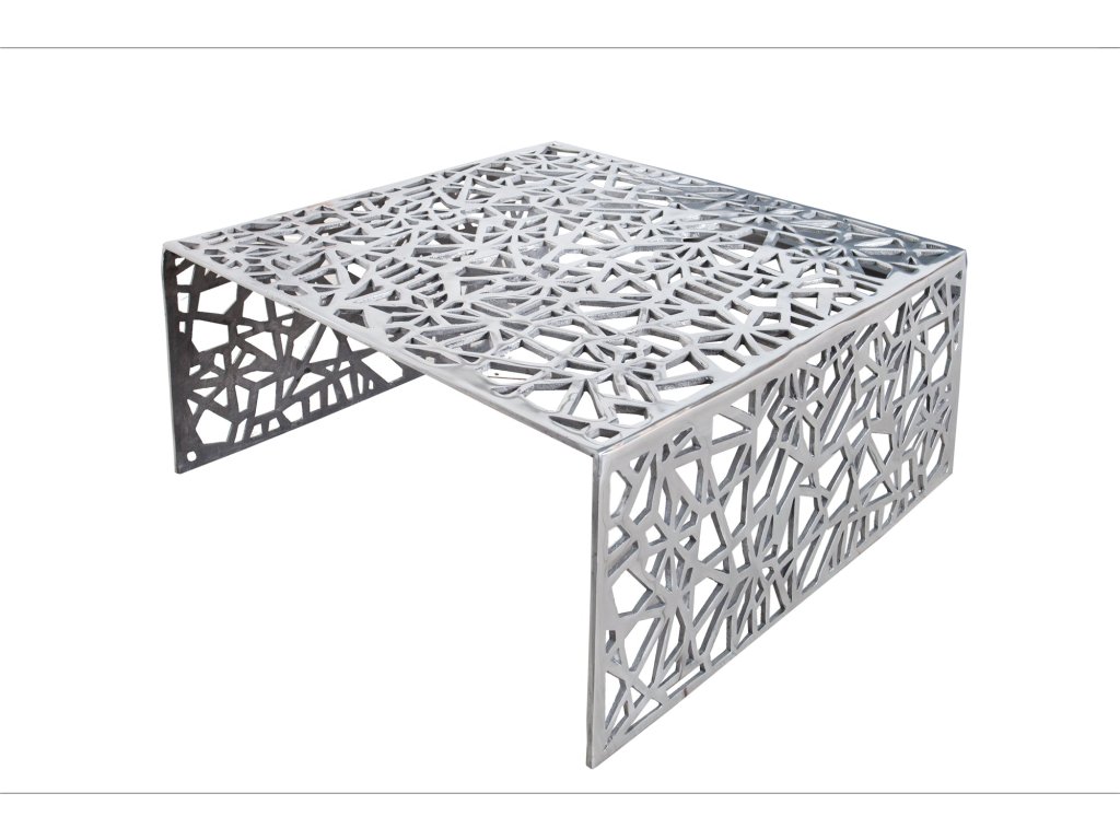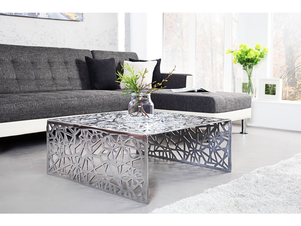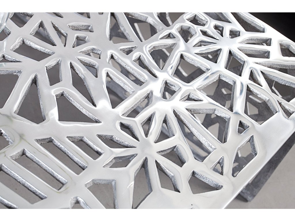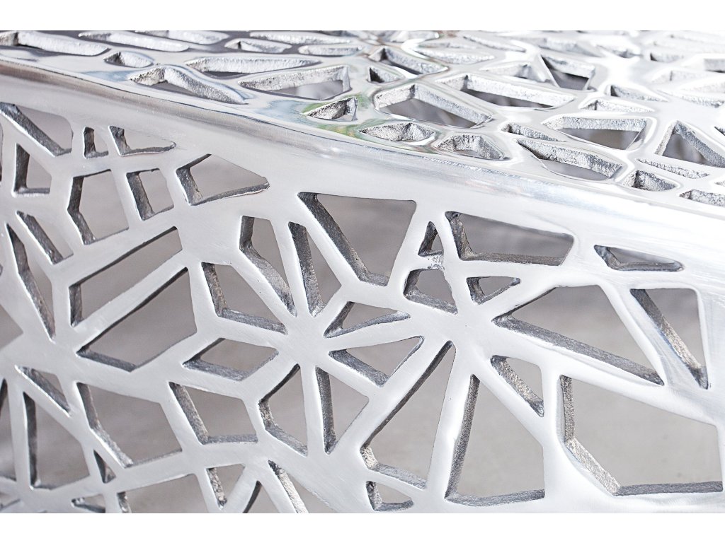 Konferenční stolek vyrobený z odolné hliníkové slitiny vyniká originálním prolamovaným designem, který připomíná abstraktní struktury a působí jako výrazný doplněk moderního interiéru. Stříbrná povrchová úprava dodává elegantní vzhled a snadno se kombinuje s neutrálními i kontrastními barvami v obývacím pokoji.