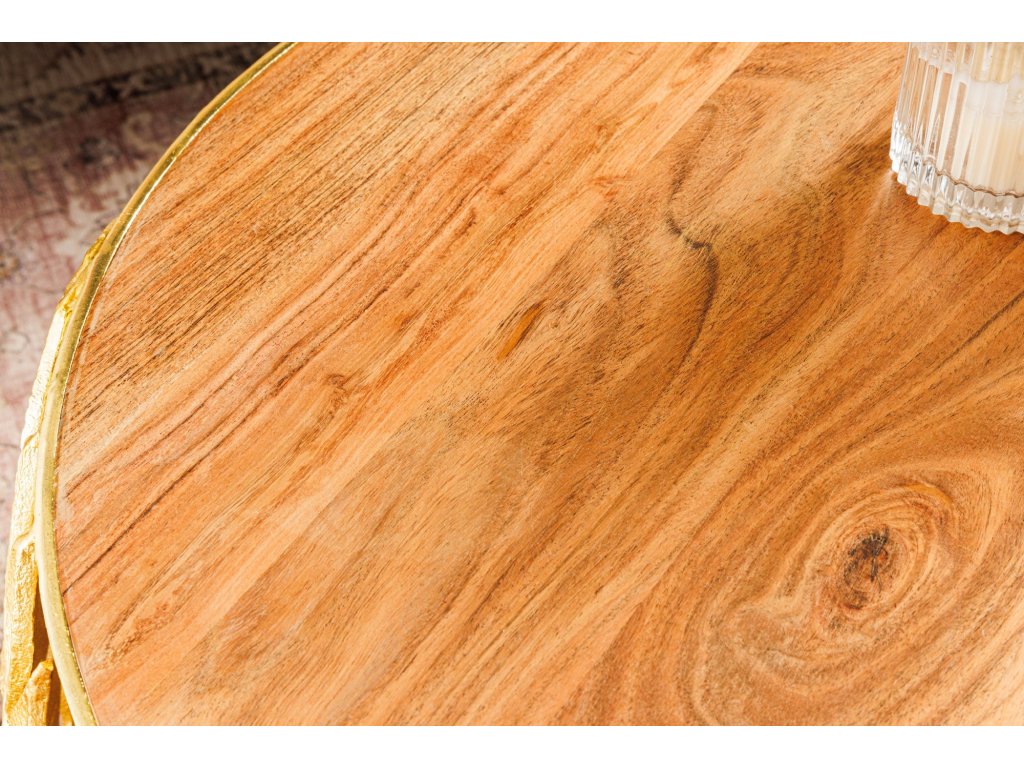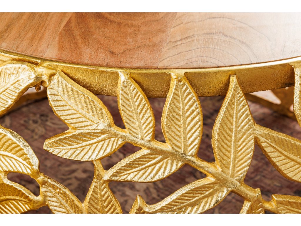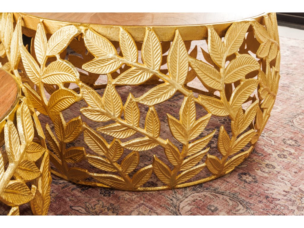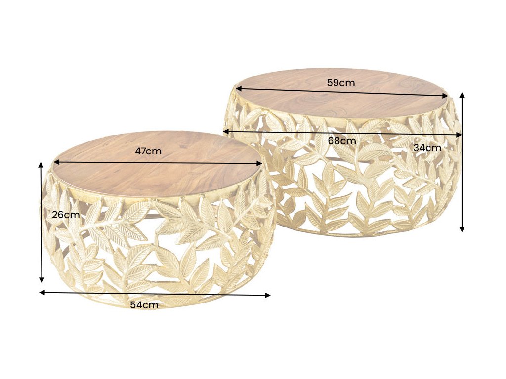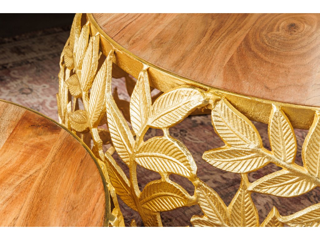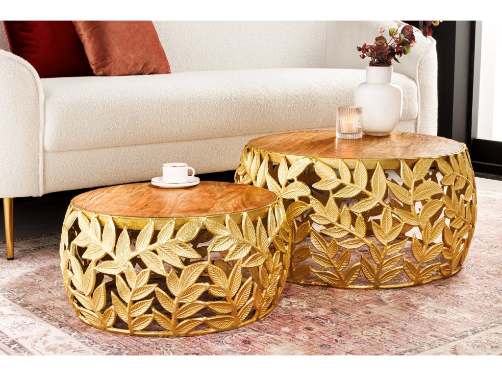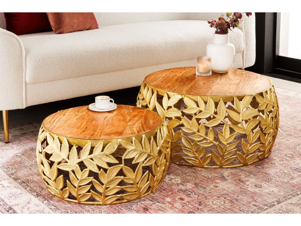Set dvou konferenčních stolků propojuje eleganci kovu a teplo přírodního dřeva. Zlatá kovová konstrukce je zdobená výrazným listovým vzorem, který působí dekorativně a přináší do interiéru luxusní akcent. Horní deska v přírodní barvě podtrhuje přirozený charakter a zajišťuje snadnou kombinaci s dalším nábytkem.