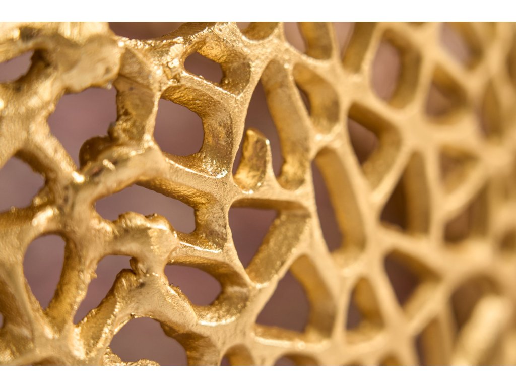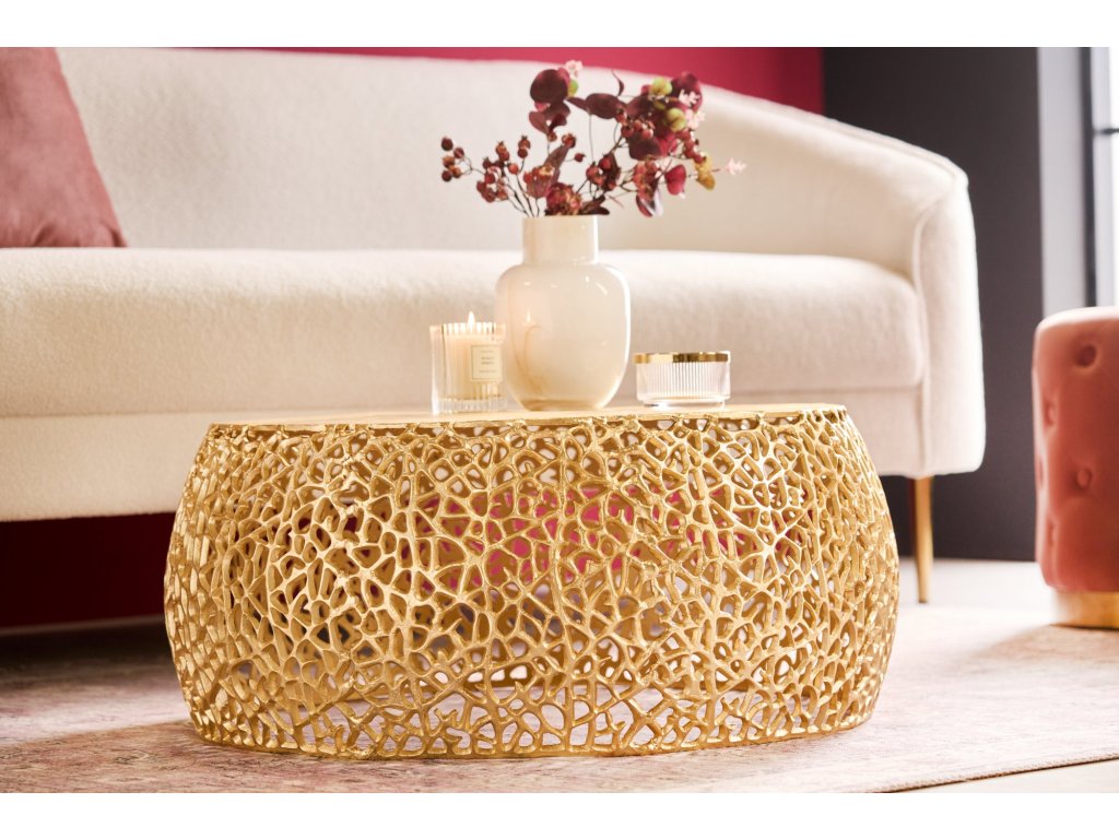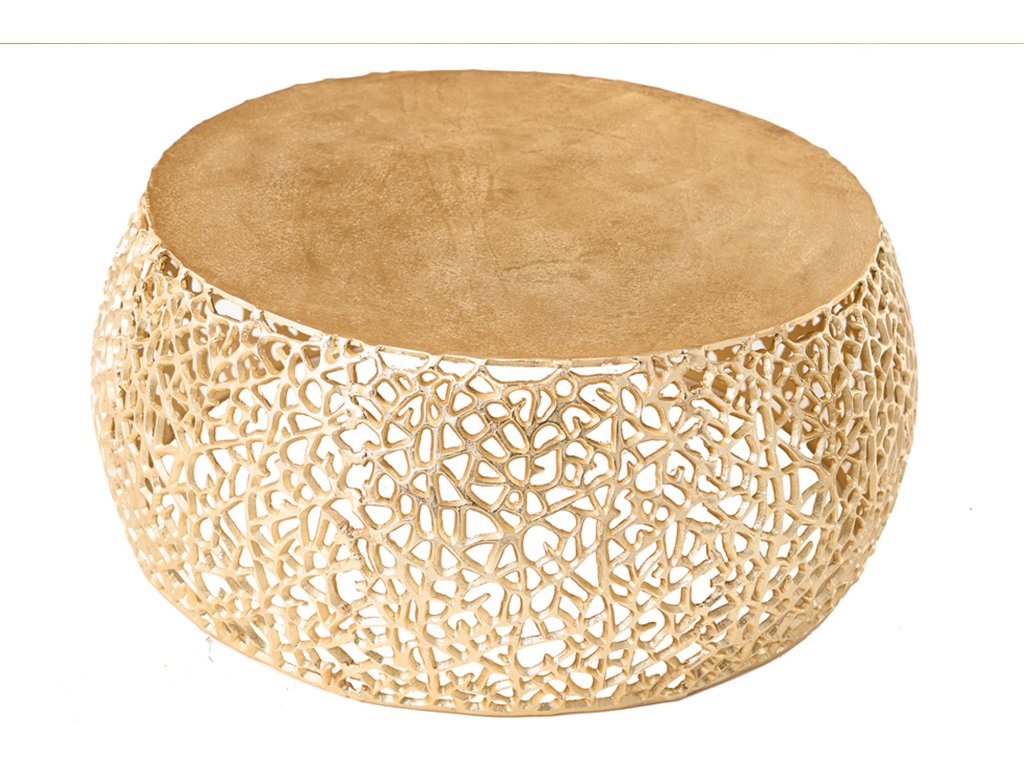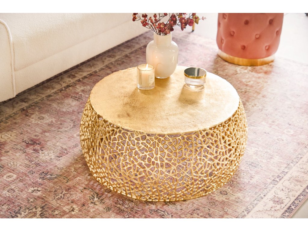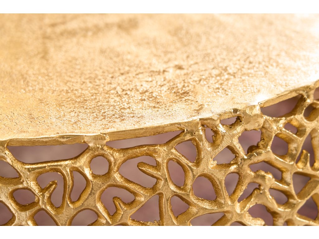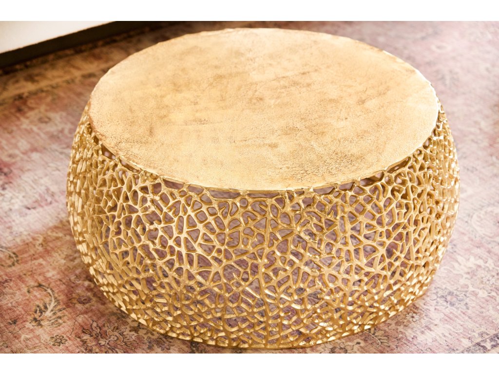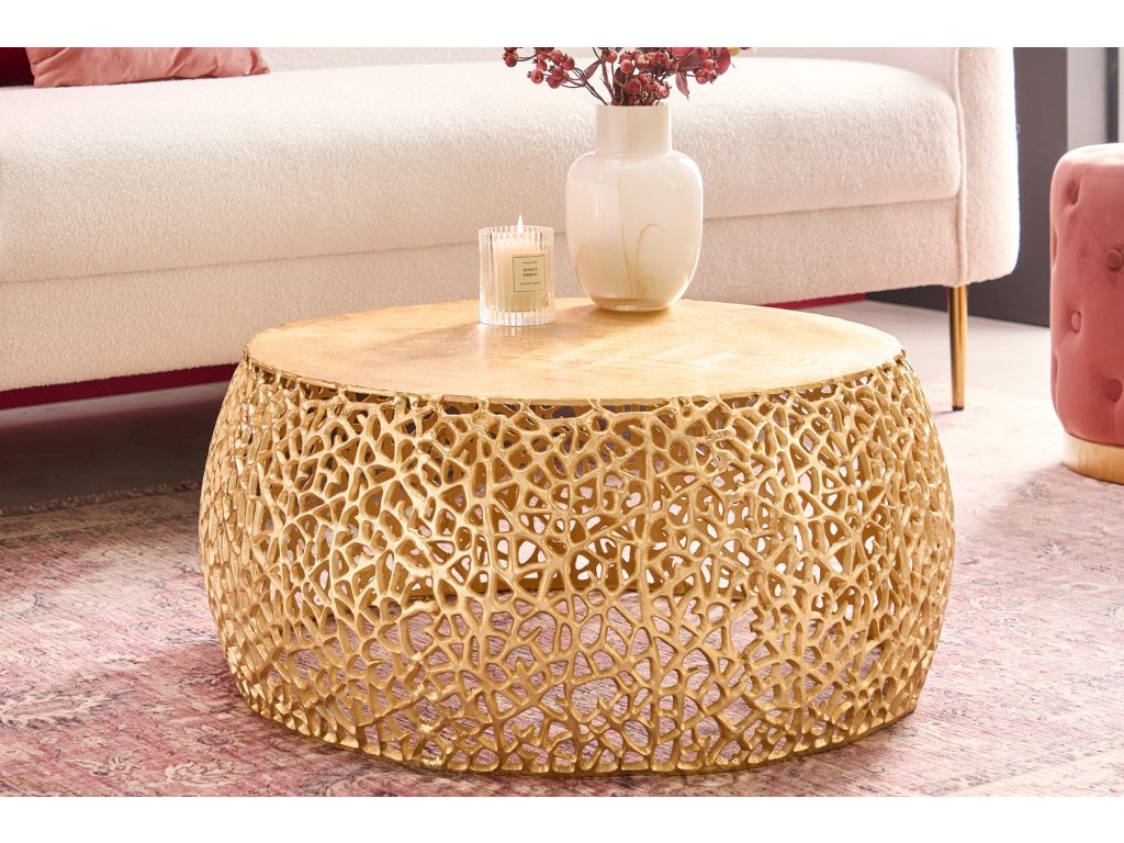 Konferenční stolek Goldcore (Ø 73 cm, výška 31 cm) je skvělým spojením moderního stylu a řemeslné preciznosti. Jeho zlatý kovový povrch působí elegantně a přináší do interiéru nádech luxusu, zatímco pevná dřevěná konstrukce dodává stabilitu a přirozené teplo. Ruční zpracování vytváří originální strukturu, díky které je každý kus naprostý unikát.