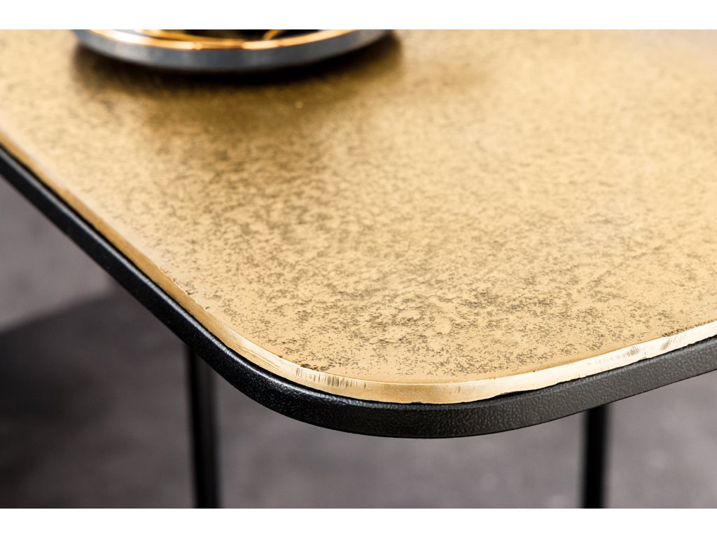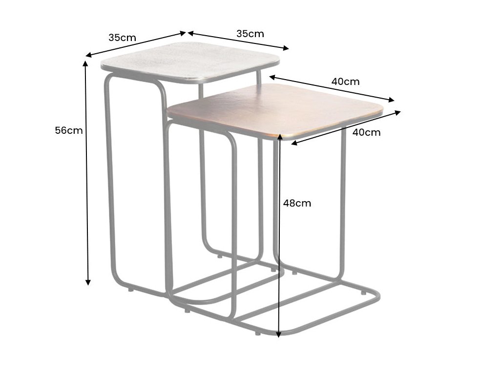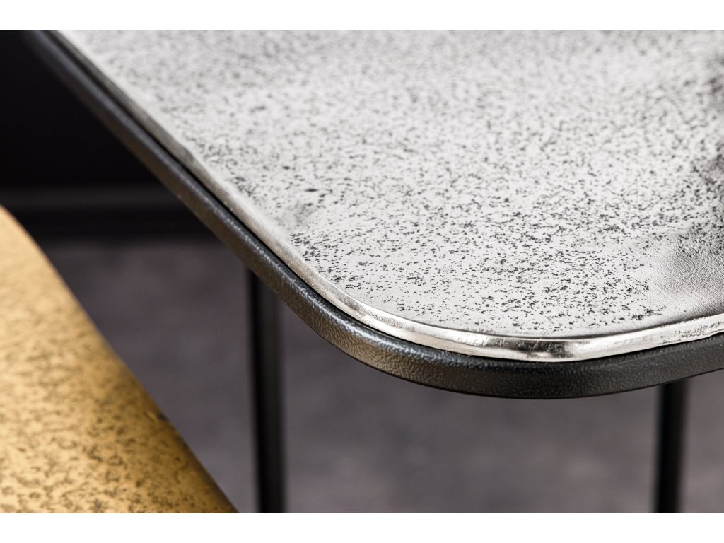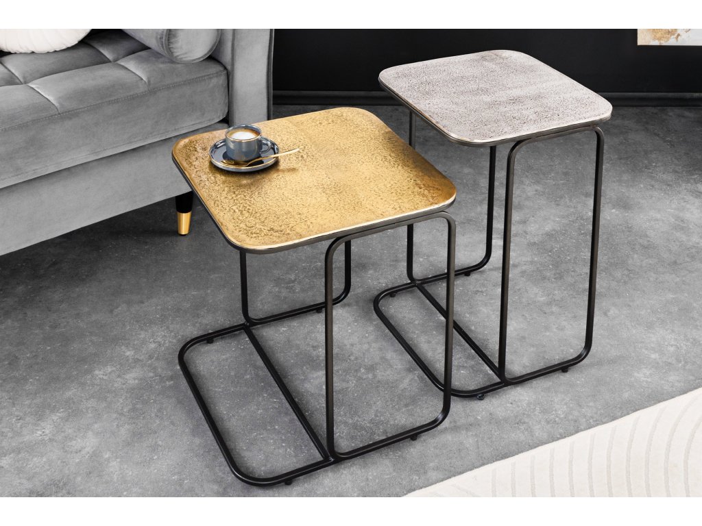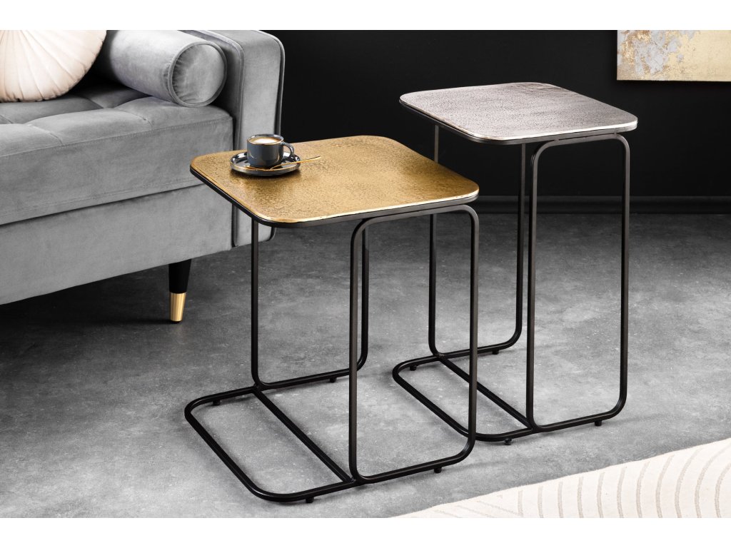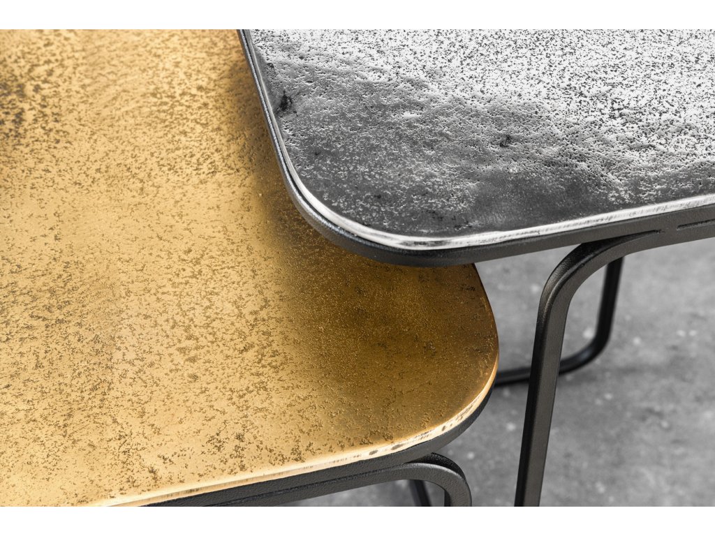 Set stolků Dualtone (40×40×48 cm) je ideální volbou pro ty, kteří hledají praktický a designový doplněk do obývacího pokoje nebo ložnice. Každý stolek má jinou povrchovou úpravu – zlatý a stříbrný odstín vytvářejí atraktivní kontrast a přinášejí do interiéru nádech luxusu.