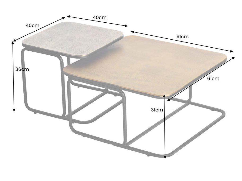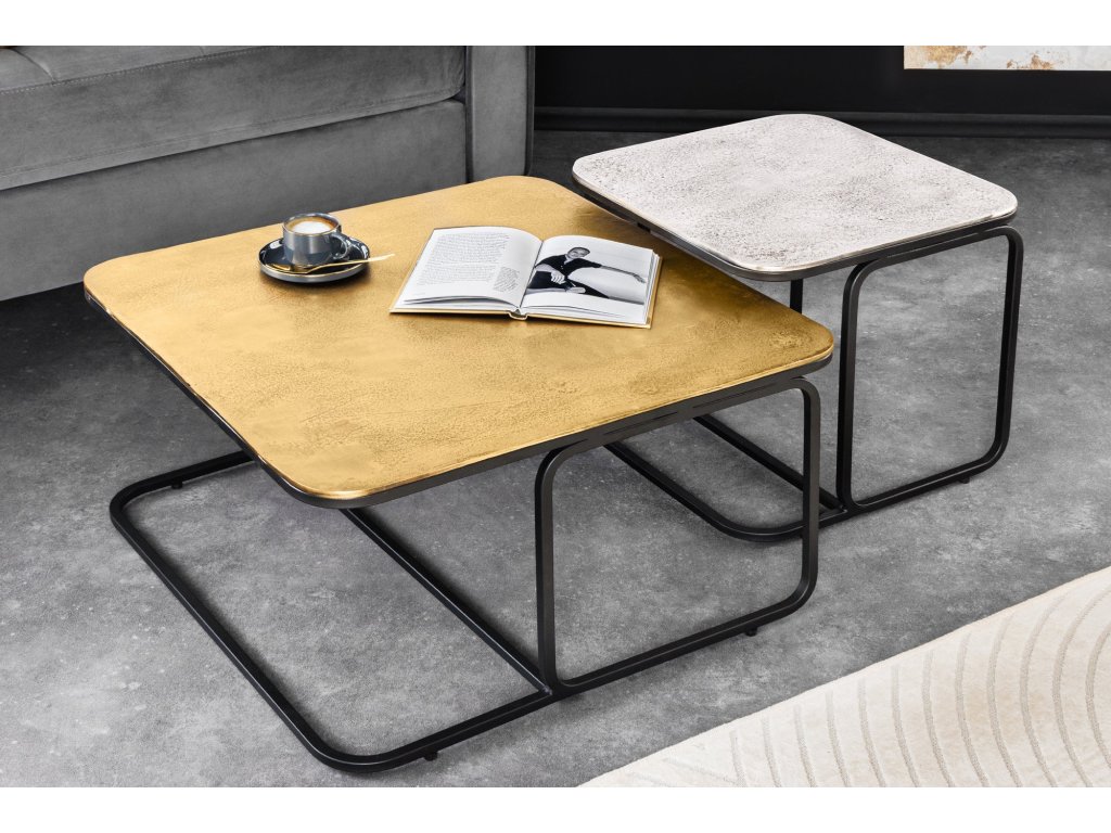 Sada konferenčních stolků RIVEN 61/40 cm přináší do interiéru unikátní spojení glamour stylu a funkčnosti. Desky z kovových hliníkových slitin v barvě zlata a stříbra působí originálně a dodávají luxusní charakter. Každý stolek je navíc jedinečný díky ručnímu zpracování povrchu.