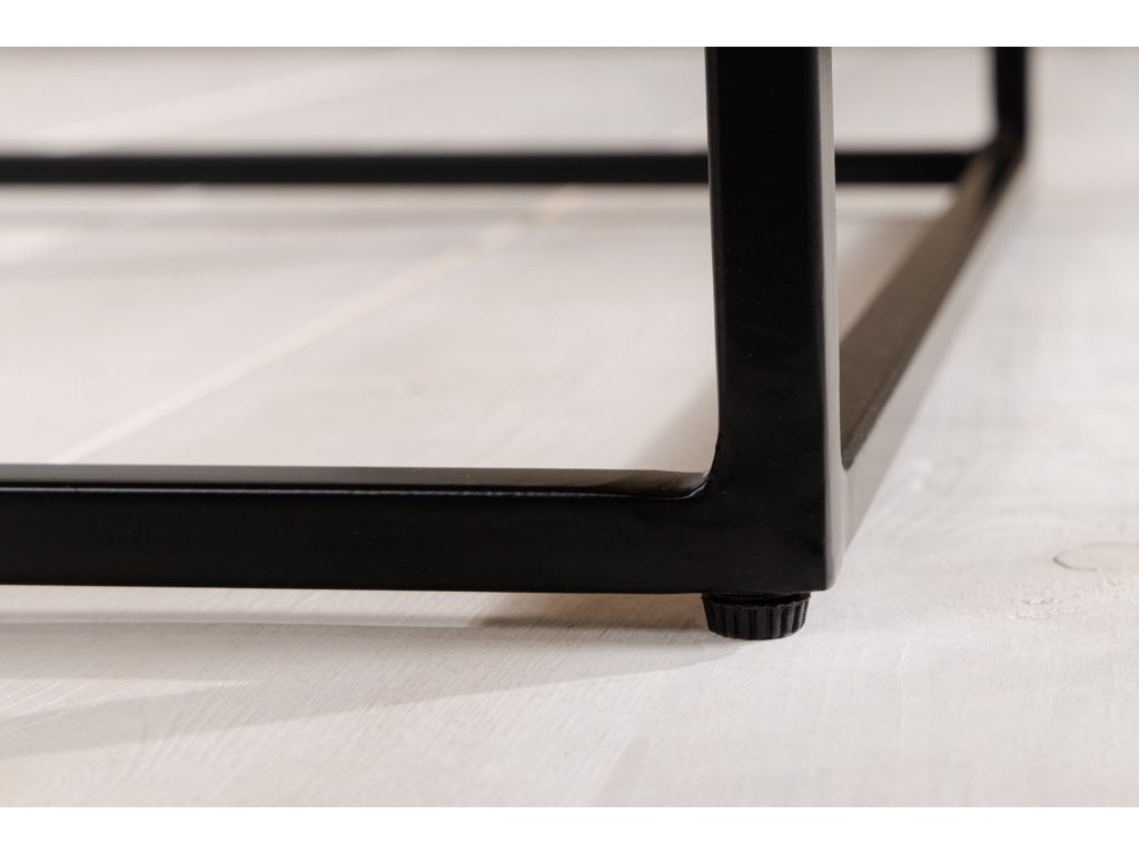 Černý kovový rám s lamelovým bočním designem působí moderně a dodává stolku vzdušnost i stabilitu. Díky svým rozměrům 100 × 55 × 40 cm se skvěle hodí do obývacího pokoje, kde poskytne dostatek prostoru pro odkládání i dekorace.