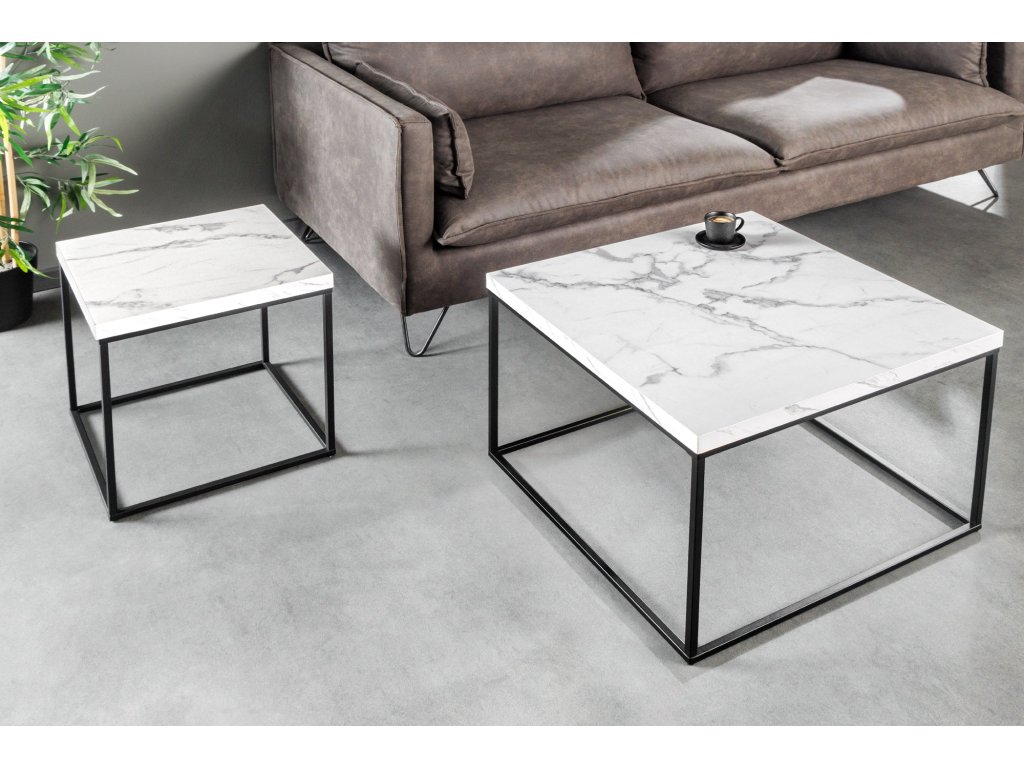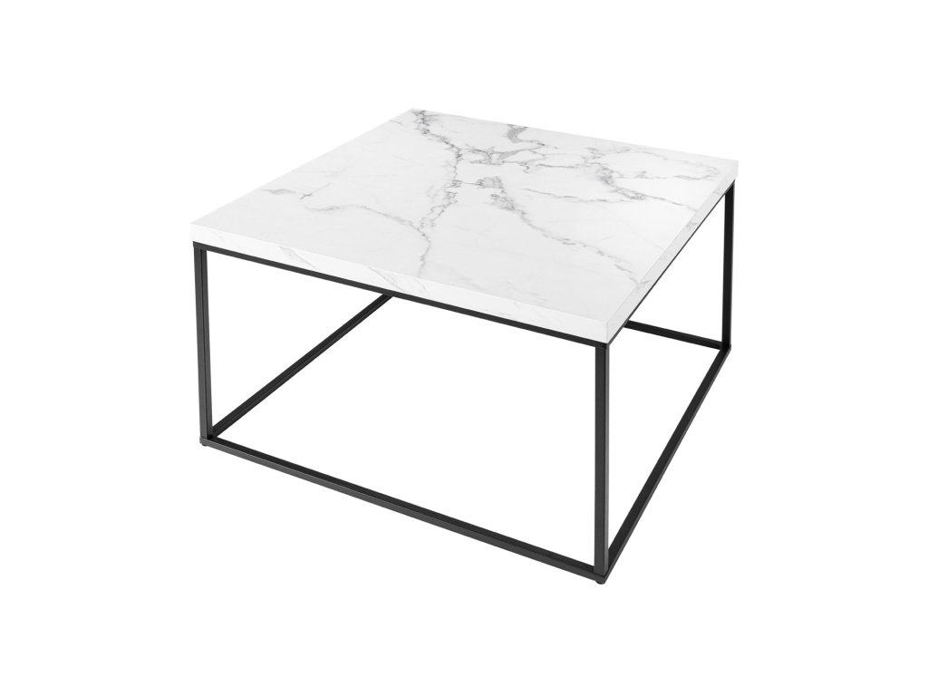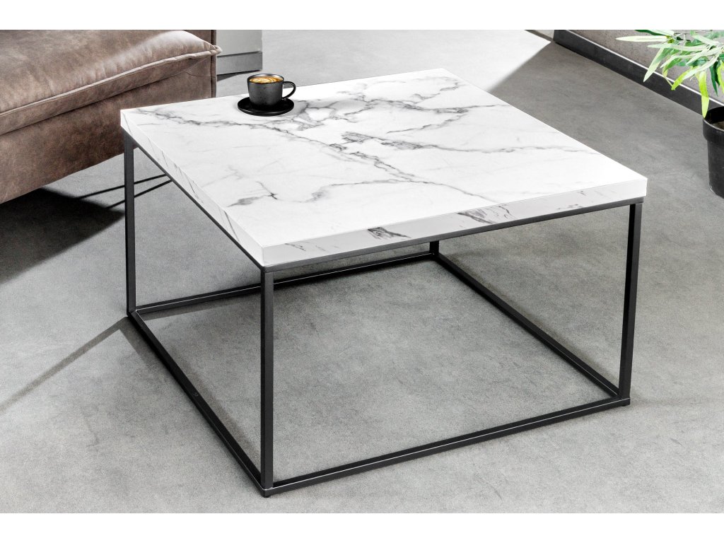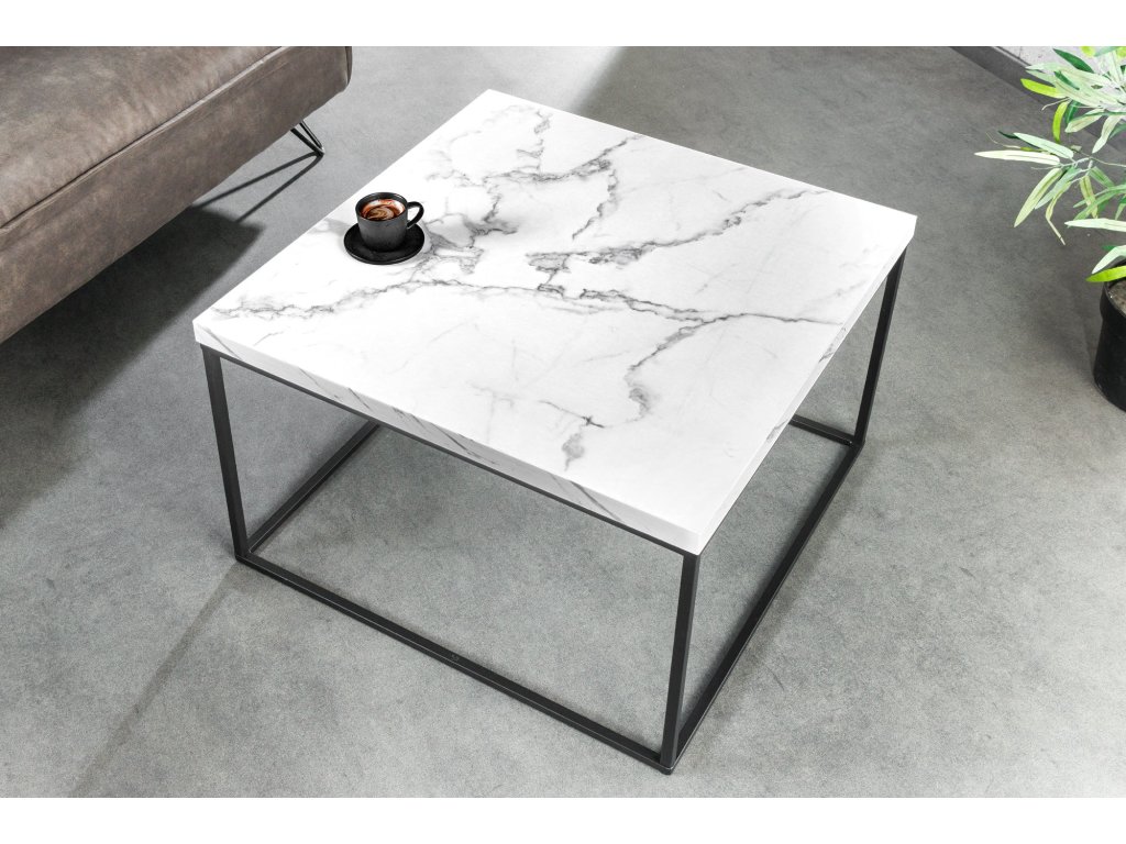 Konstrukce z černého práškově lakovaného kovu zajišťuje stabilitu a vytváří atraktivní kontrast k bílé mramorové desce. Díky praktickým rozměrům 60 × 60 × 45 cm je ideální volbou do menších i středně velkých obývacích pokojů.
