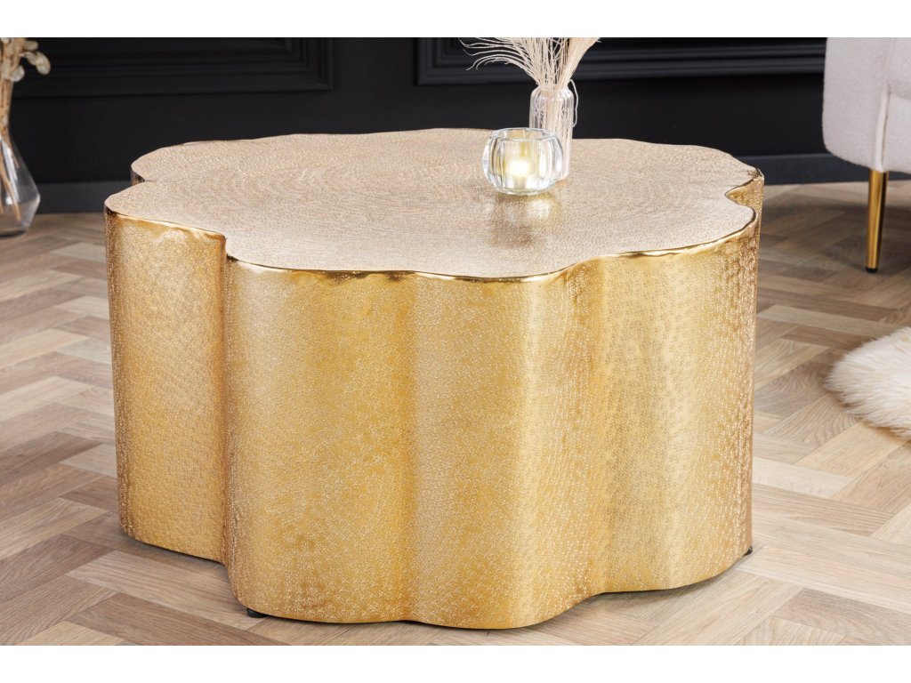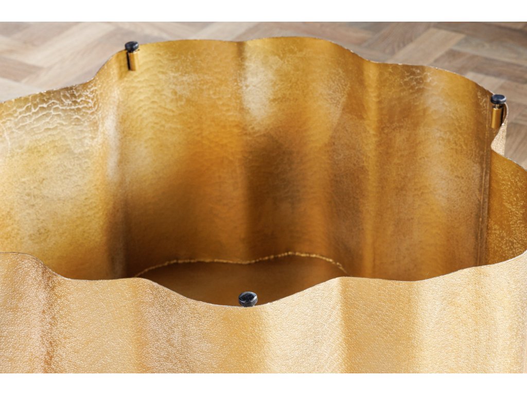 Konferenční stolek BIO ORIENT (Ø 70 cm) představuje spojení moderního stylu a uměleckého řemesla. Je vyroben z kvalitní hliníkové slitiny, která zaručuje výjimečnou pevnost a dlouhou životnost. Povrch je opatřen zlatou patinou s jemnou strukturou, která evokuje luxusní ruční opracování kovu.