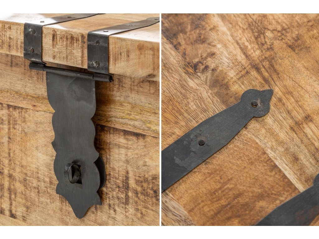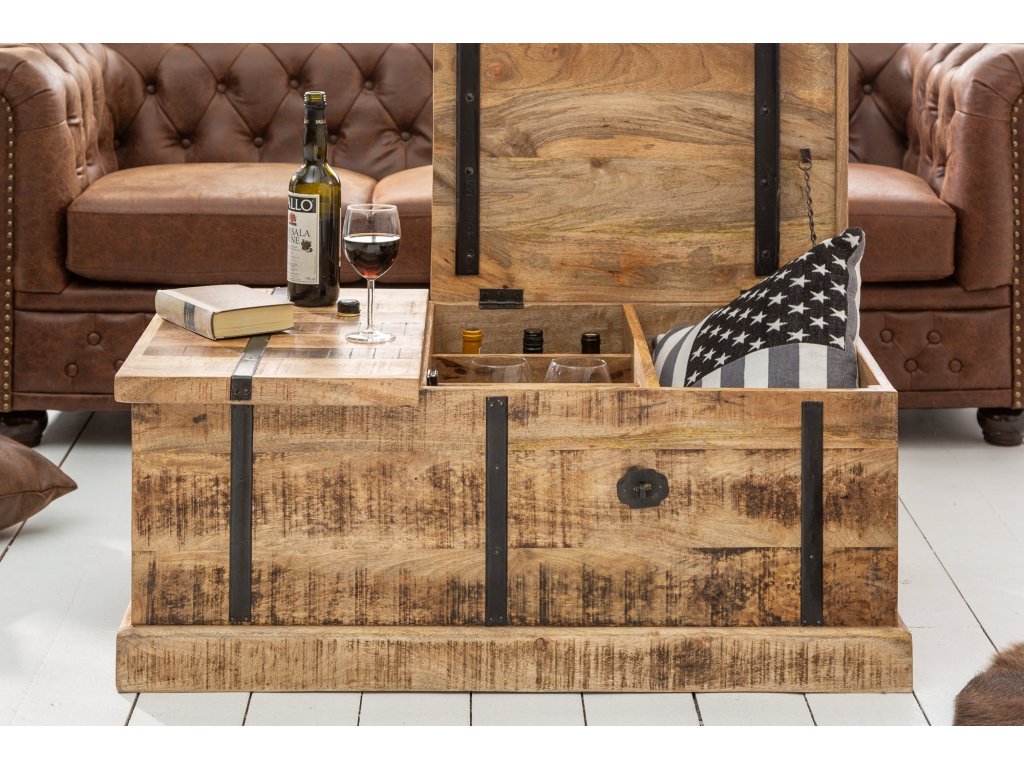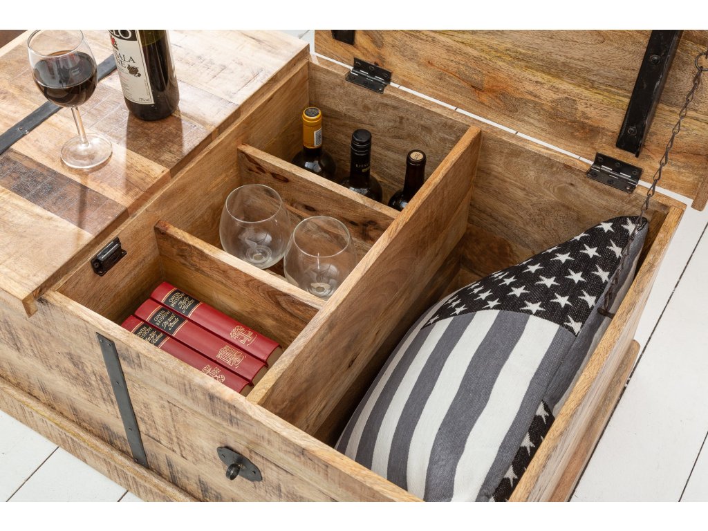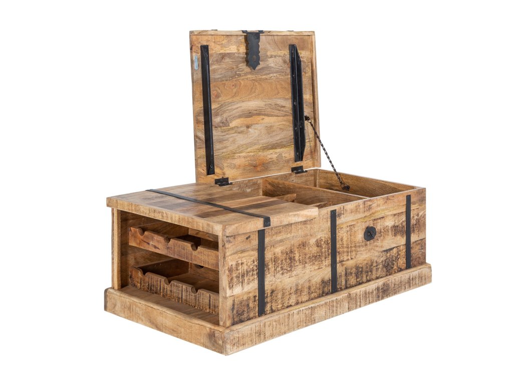 Stolek zaujme nejen svým vzhledem, ale i funkčností – nabízí praktický úložný prostor s výklopnou deskou, přihrádkami a úchyty ve stylu rustikálních truhlářských beden. Kovové doplňky v černé barvě dodávají robustní industriální akcent a zajišťují vysokou odolnost.