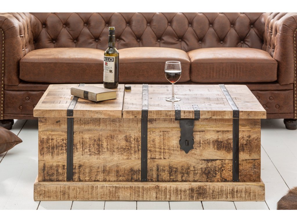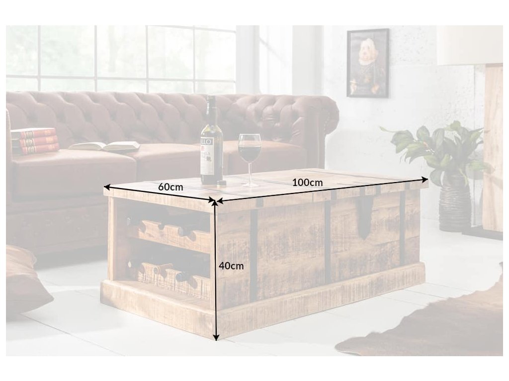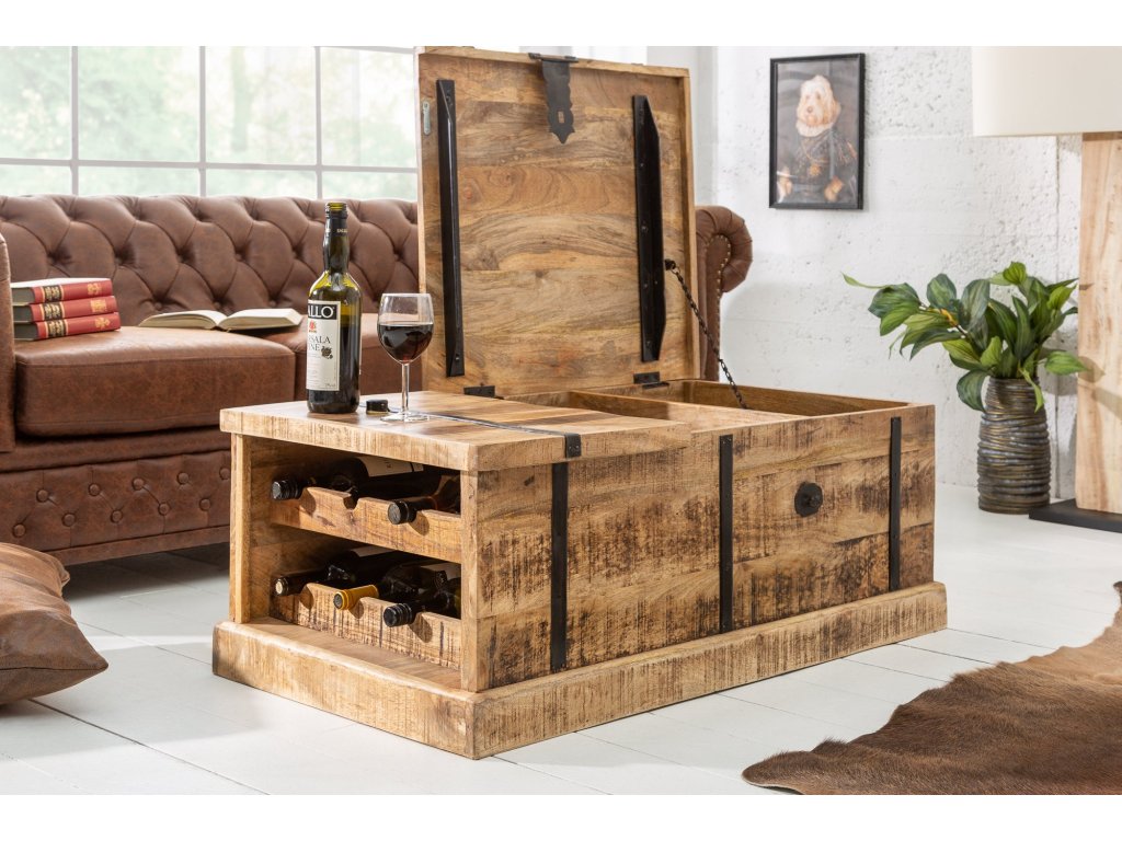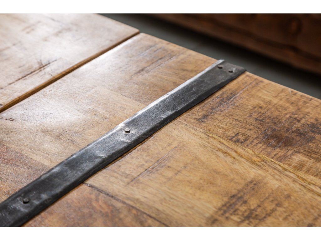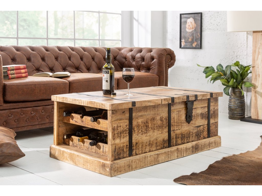 Stolek zaujme nejen svým vzhledem, ale i funkčností – nabízí praktický úložný prostor s výklopnou deskou, přihrádkami a úchyty ve stylu rustikálních truhlářských beden. Kovové doplňky v černé barvě dodávají robustní industriální akcent a zajišťují vysokou odolnost.