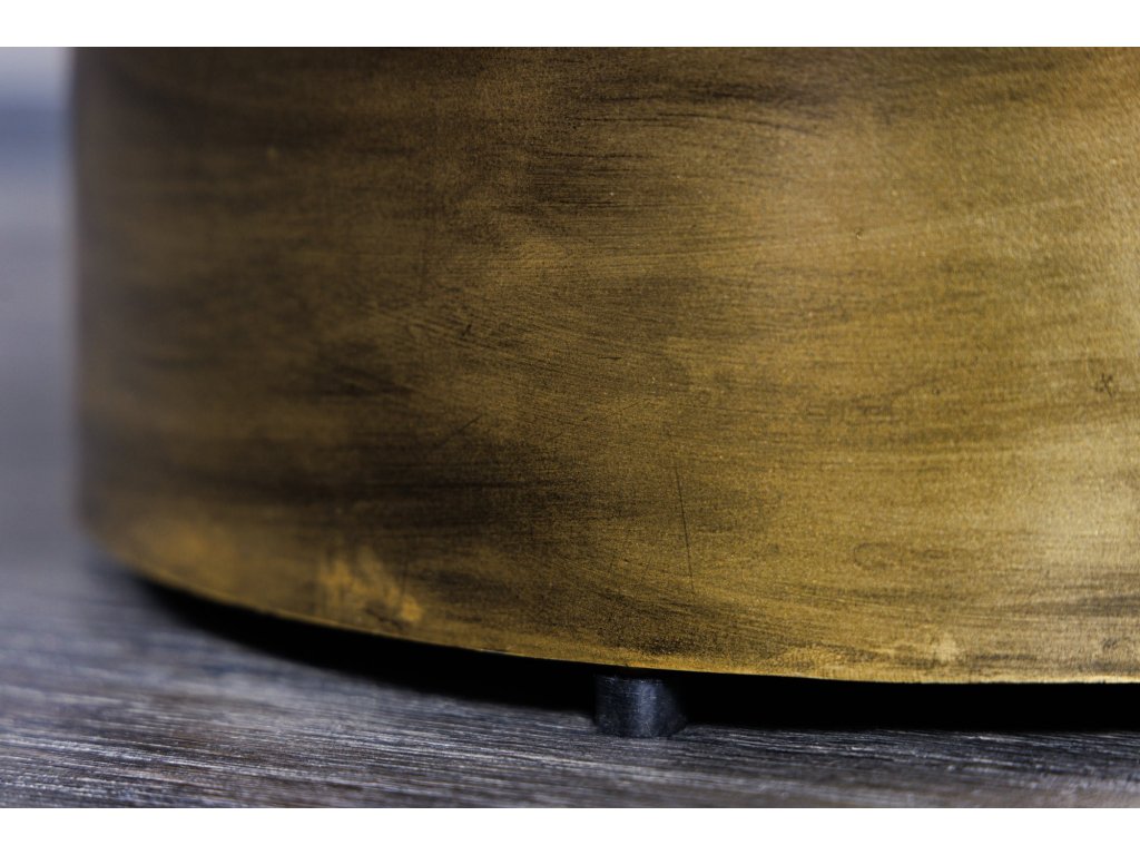 Stolek stojí na pevné kovové podstavě ve zlatém odstínu, která podtrhuje luxusní vzhled a zároveň zajišťuje stabilitu. Díky svým rozměrům je ideální jako konferenční stolek do obývacího pokoje, kde poslouží nejen prakticky, ale i jako designový prvek.