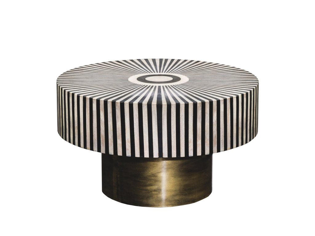 Konferenční stolek BONE INLAY je výjimečný solitér, který v interiéru okamžitě upoutá pozornost. Kulatá deska s precizním kontrastním vzorem v bílé a černé barvě vytváří výrazný dekorativní efekt a dodává prostoru osobitý charakter.