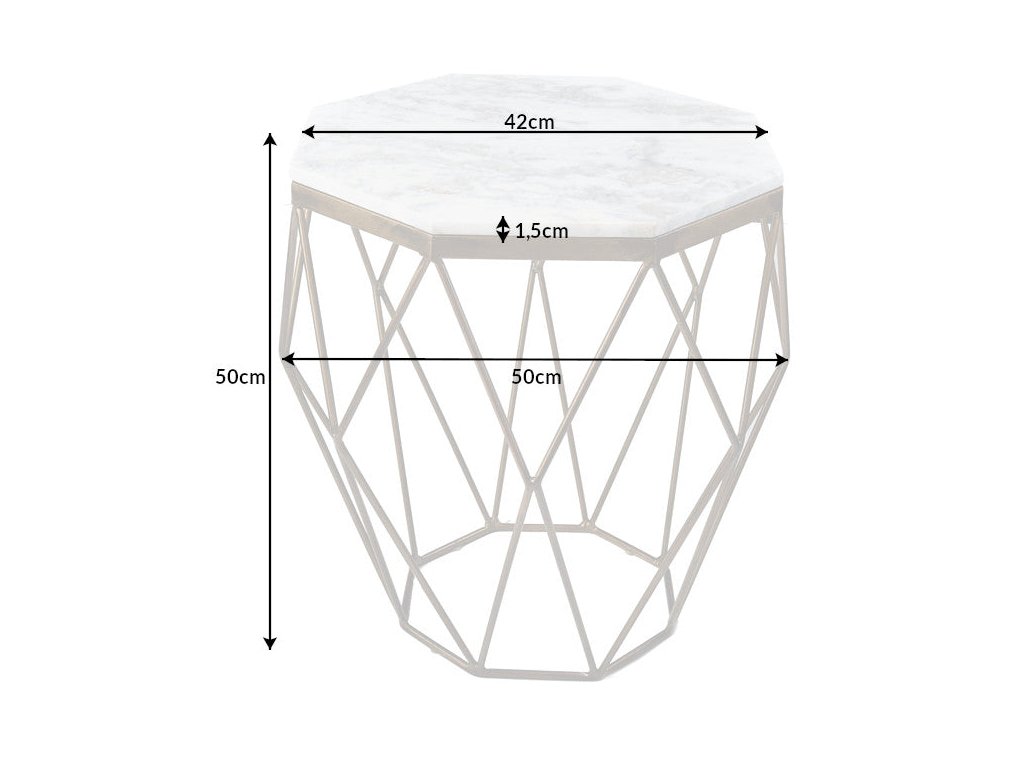 Konferenční stolek AURELIA DIAMOND zaujme svým geometrickým tvarem a precizně zpracovanou mramorovou deskou v jemném světlém tónu. Šestihranná deska působí vzdušně a zároveň luxusně, zatímco otevřená kovová konstrukce ve zlatém provedení dodává stolku lehkost a výrazný architektonický charakter.