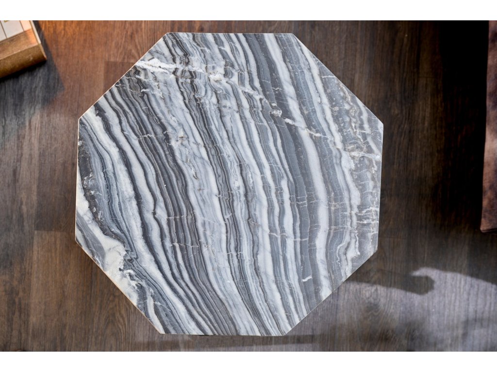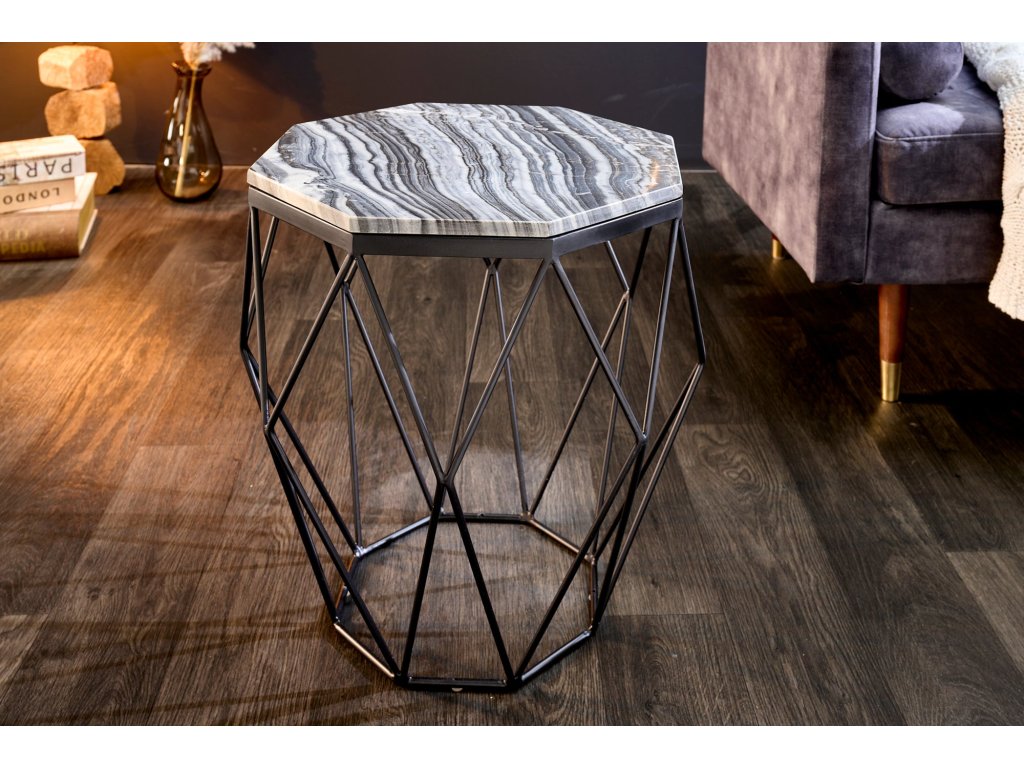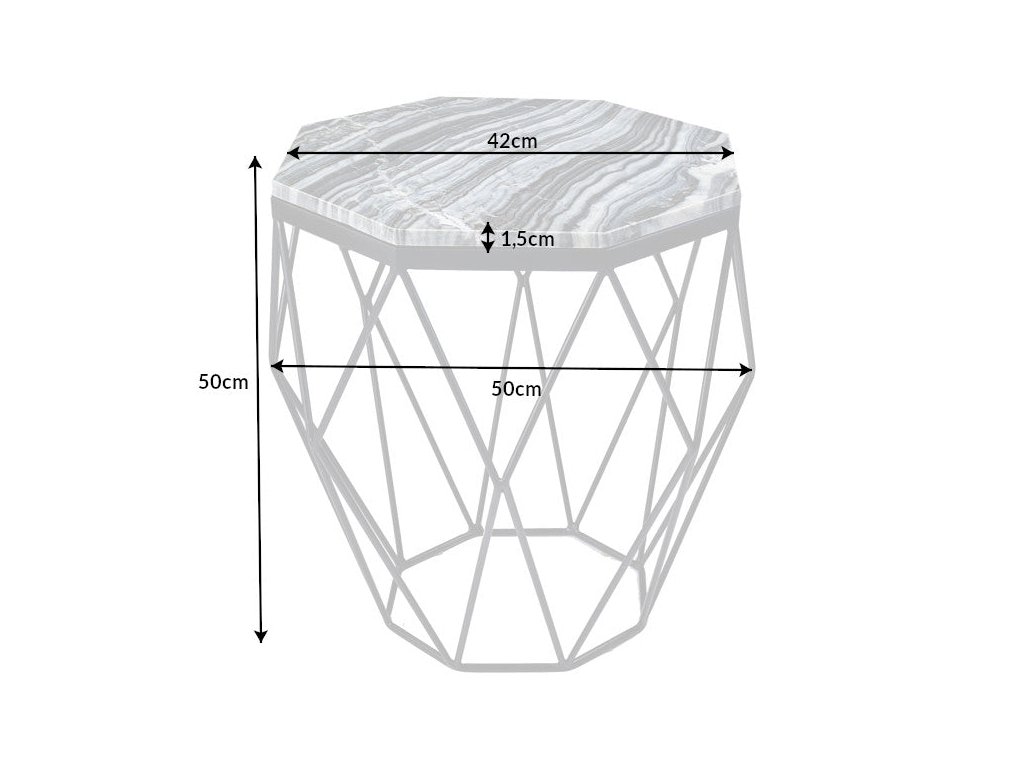 Konferenční stolek DIAMOND 50 cm zaujme svou kombinací přírodního mramoru v šedých odstínech a originální kovové konstrukce ve tvaru diamantu. Každý kus je jedinečný díky přirozené kresbě kamene, která dělá z každého stolku autentický originál. Robustní železný rám v černé barvě zajišťuje stabilitu a kontrastuje s elegantní kamennou deskou. Tento stolek je nejen praktickým doplňkem, ale i výrazným designovým prvkem, který dodá vašemu obývacímu pokoji luxusní charakter.
