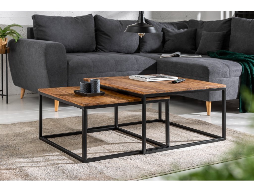Díky rozdílné velikosti lze stolky variabilně kombinovat – zasunout pod sebe, rozestavit vedle sedačky nebo využít každý zvlášť. Výrazná kresba dřeva dodává celku přirozený charakter, zatímco černý kovový rám podtrhuje industriální styl.