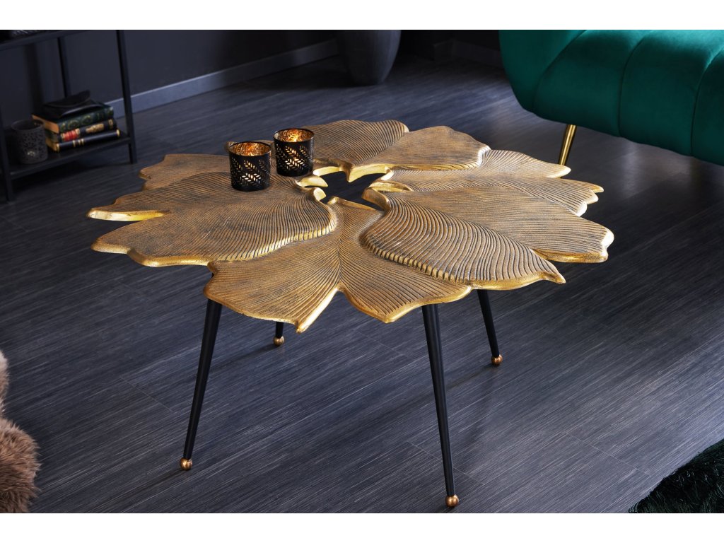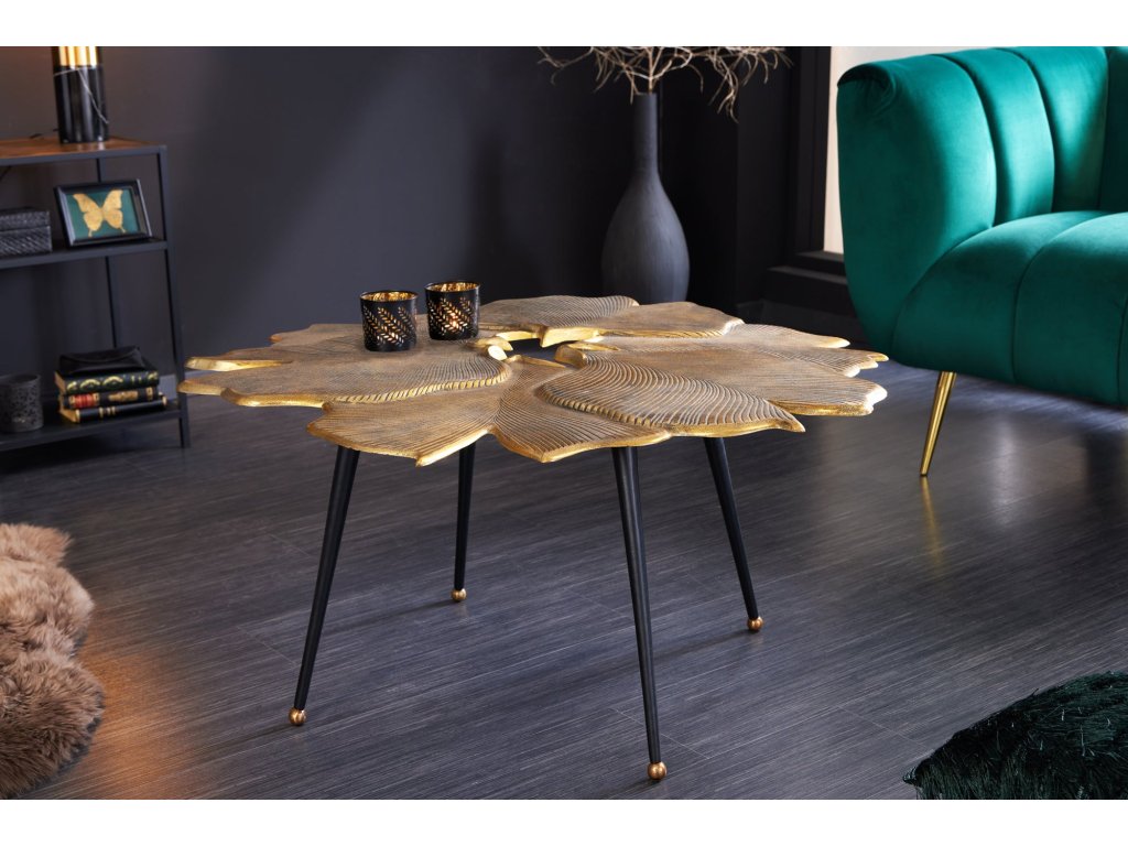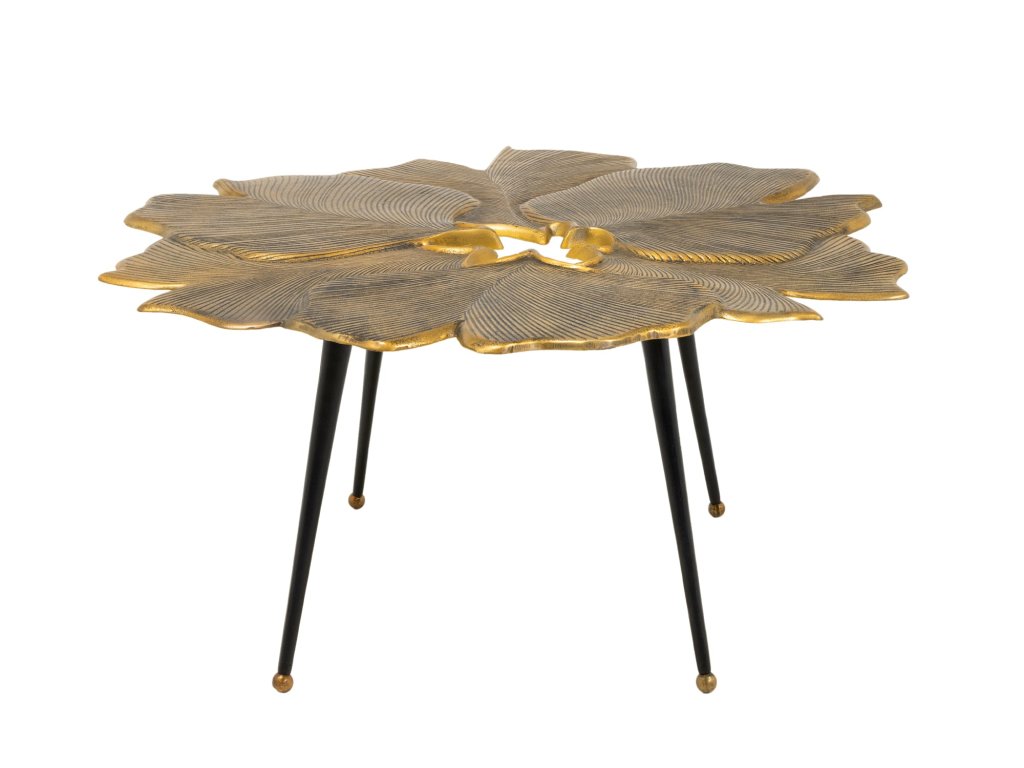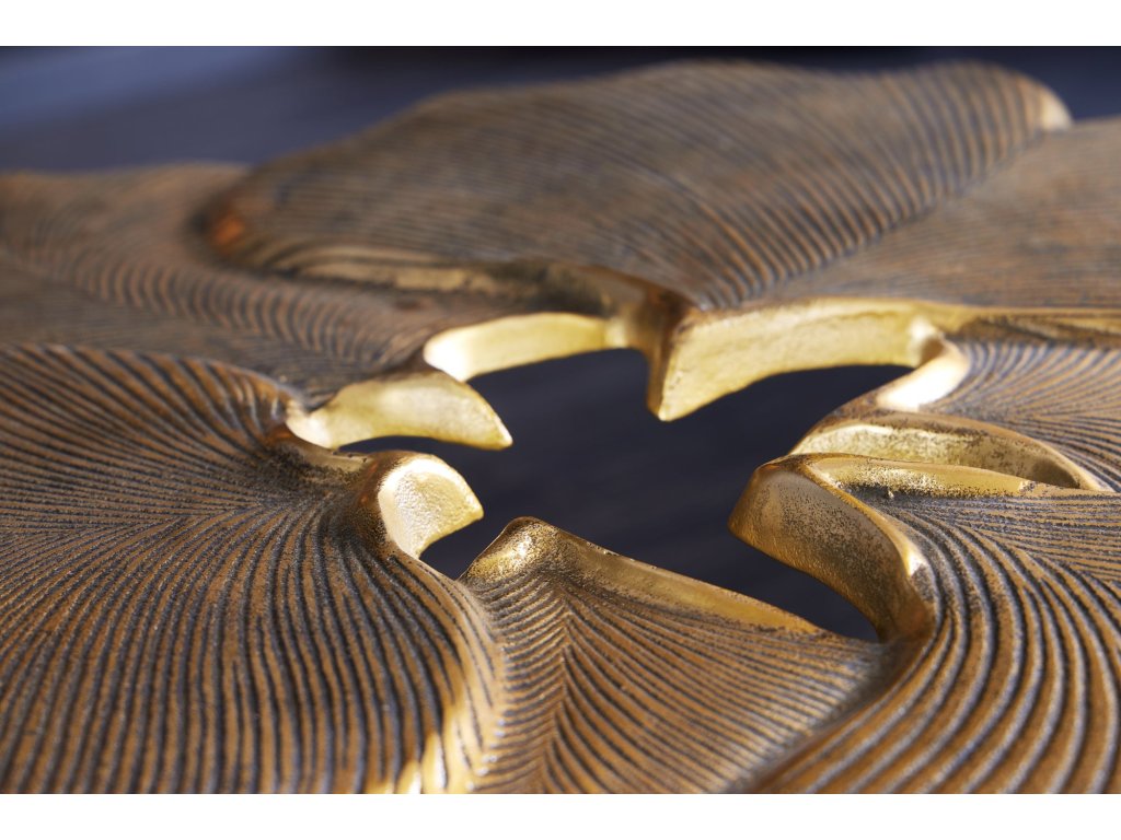 Konferenční stolek FLORÉA GOLD je skutečným uměleckým prvkem. Jeho atypická deska inspirovaná tvarem květu zaujme detailním reliéfem připomínajícím přírodní strukturu listů, který vytváří jedinečnou hru světla a stínu.