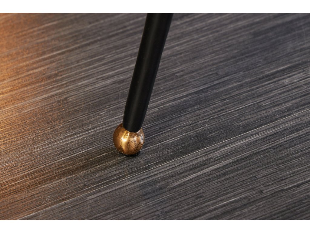 Zlaté provedení dodává stolku luxusní a exkluzivní charakter, zatímco subtilní černé kovové nohy zajišťují stabilitu a vizuální lehkost. Kontrast mezi bohatě zdobenou deskou a minimalistickou podnoží působí moderně a velmi vyváženě.