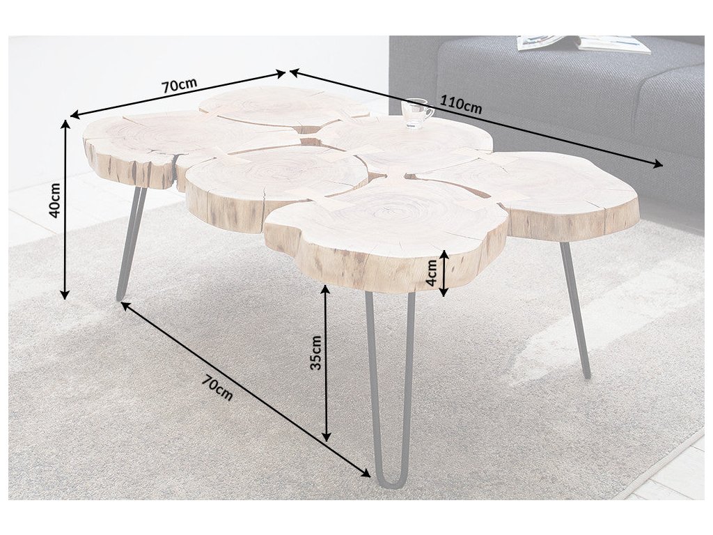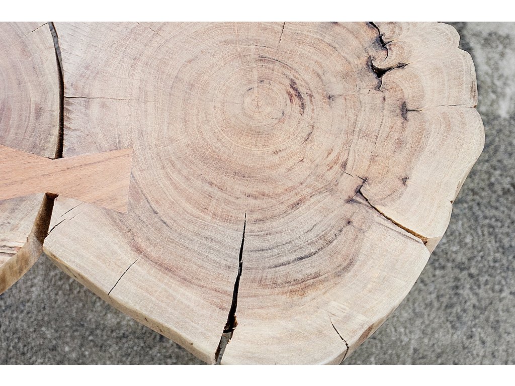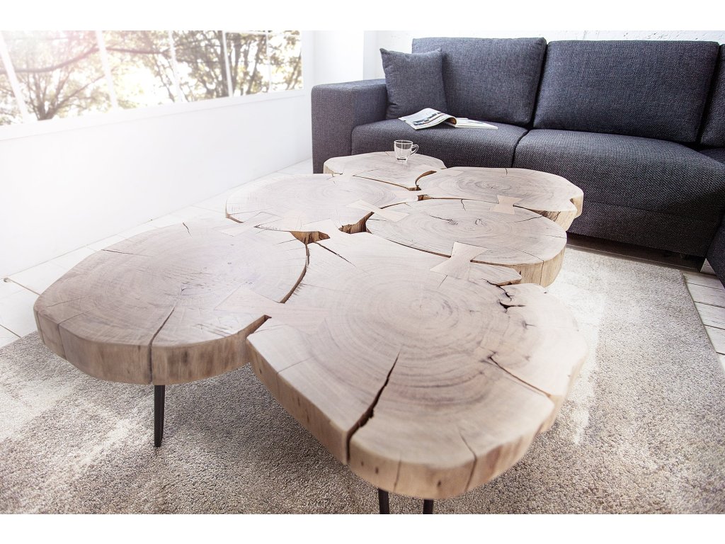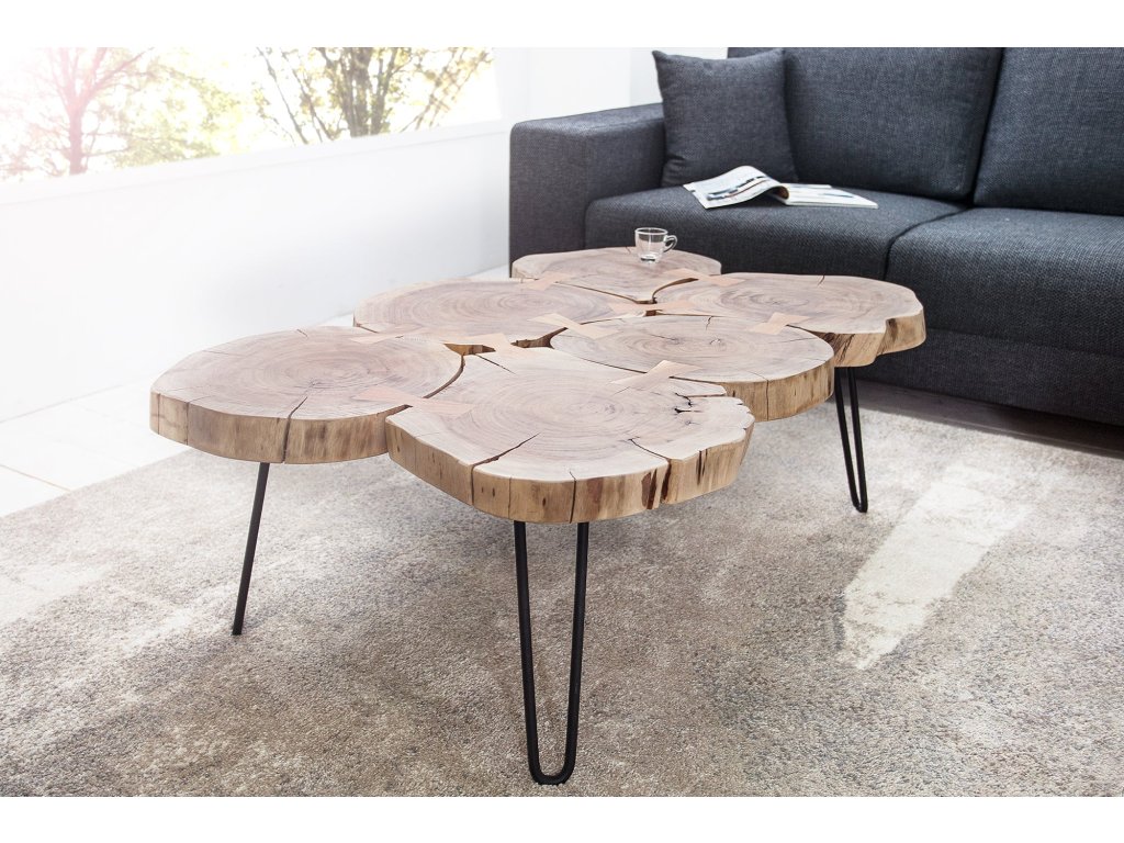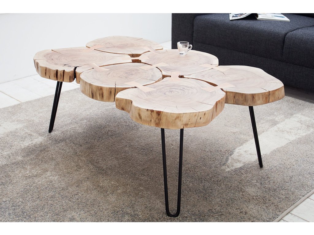 Konferenční stolek GOA je skutečný solitér, který do interiéru přináší autentickou přírodu. Deska je tvořena z masivního akátového dřeva s přirozenou kresbou a nepravidelnými tvary jednotlivých kusů, díky čemuž je každý stolek originál.