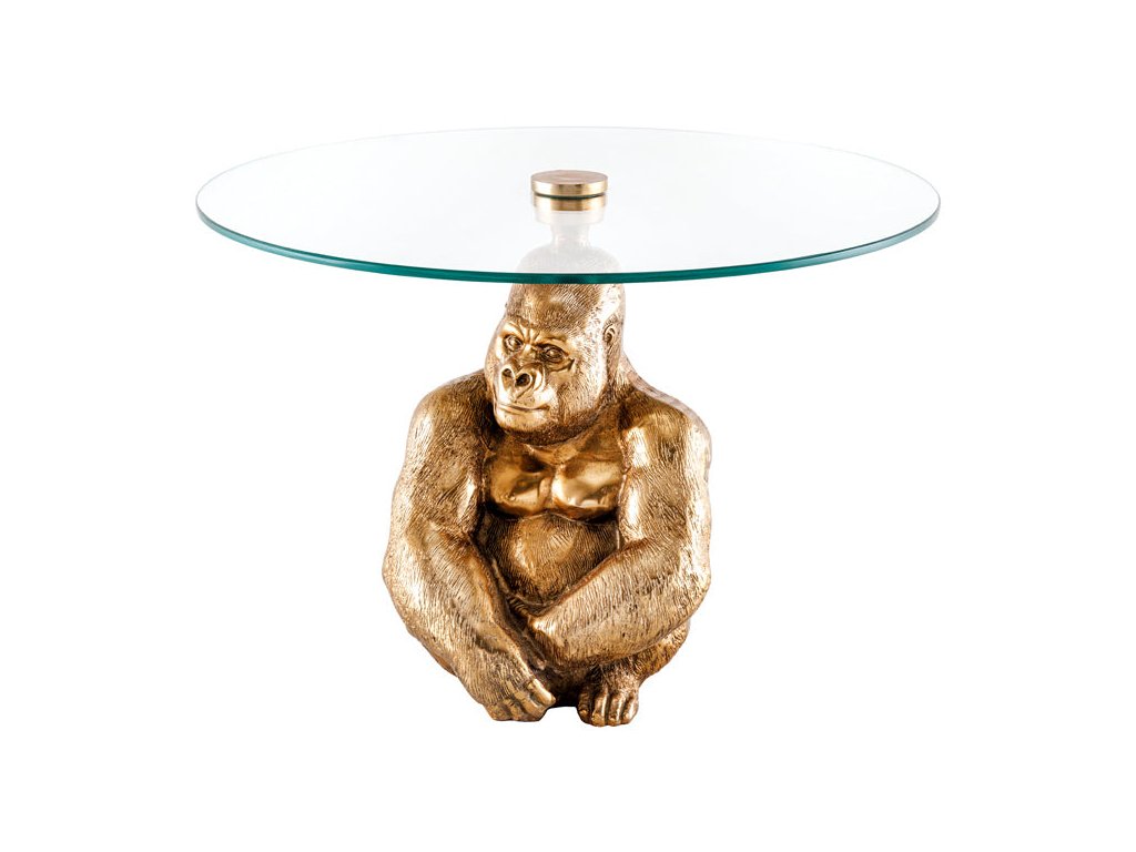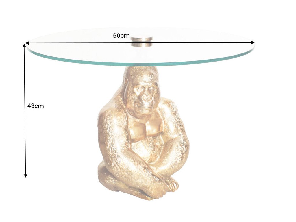 Konferenční stolek GOLDEN GORILLA je nepřehlédnutelný solitér, který funguje stejně silně jako nábytek i jako umělecký objekt. Masivní podstava ve tvaru gorily s detailním zpracováním působí monumentálně, sebevědomě a luxusně. Kulatá čirá skleněná deska celý design vizuálně odlehčuje a dává vyniknout sochařskému základu.