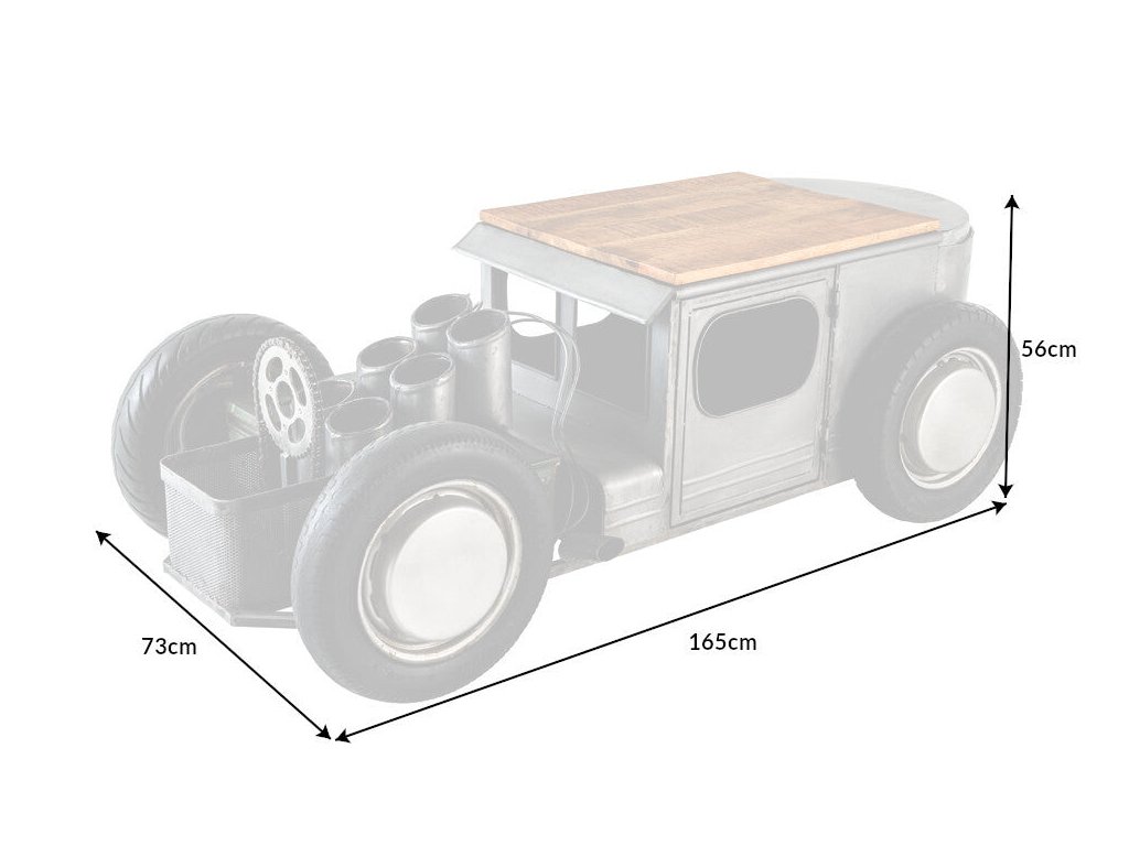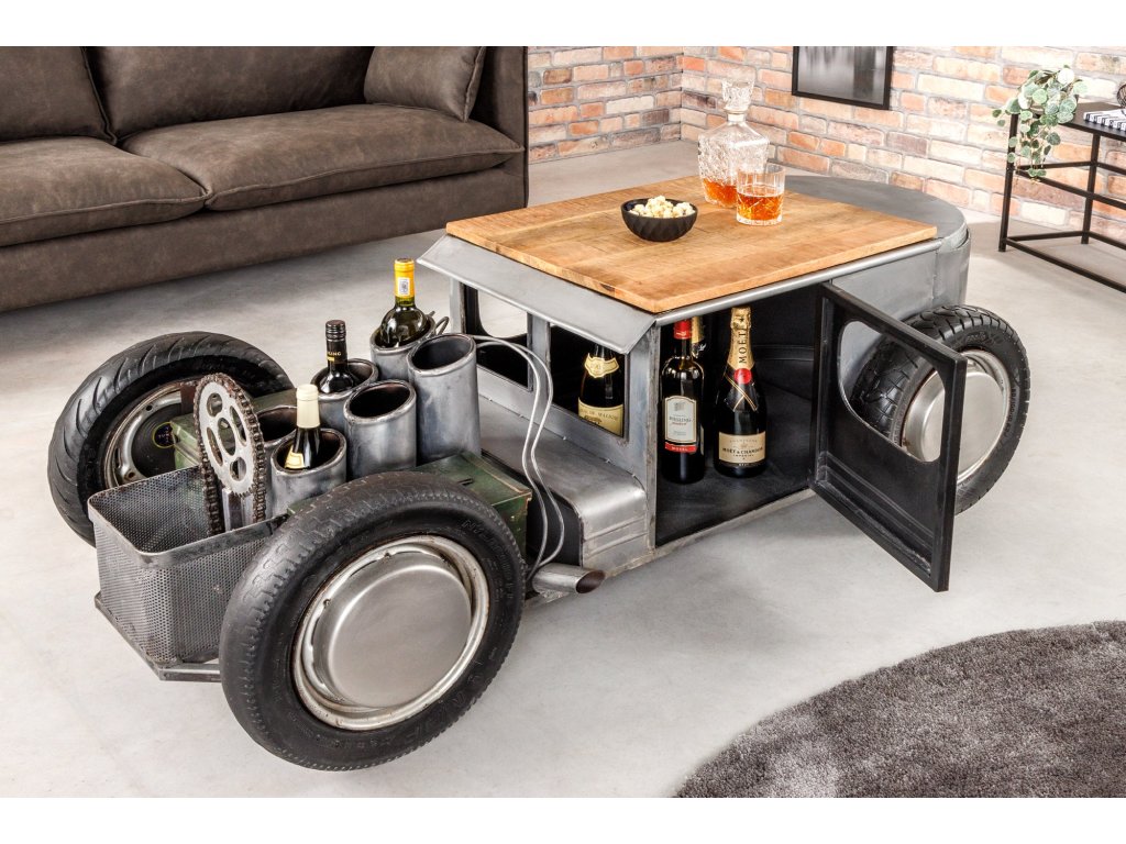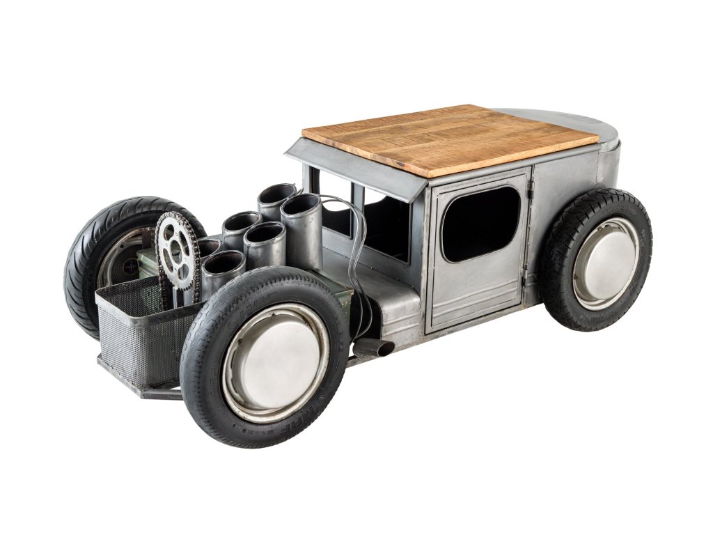 Konferenční stolek IRON GARAGE je výrazný solitér, který si okamžitě získá pozornost. Design inspirovaný starým hot rodem spojuje technický vzhled kovu, autentické detaily v podobě kol a industriálních prvků s teplým masivním dřevem na horní desce. Výsledkem je jedinečný kus nábytku s charakterem.