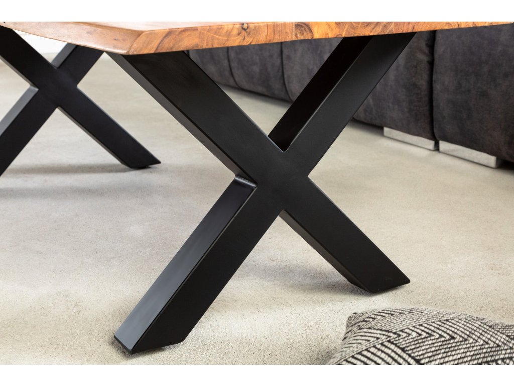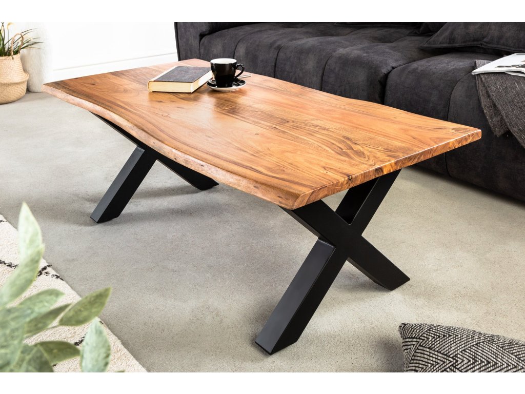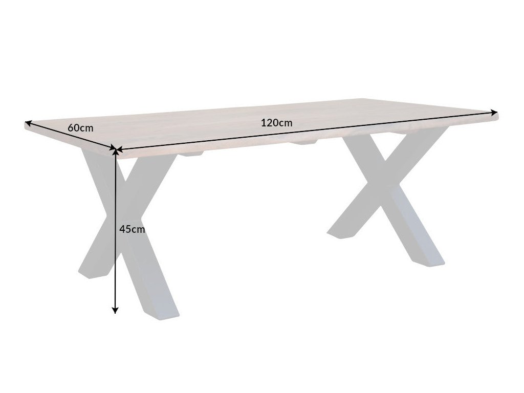 Stabilní kovová podnož ve tvaru X s práškovou povrchovou úpravou zajišťuje vysokou pevnost, stabilitu a zároveň výrazný industriální design. Rozměr 120 × 60 cm nabízí dostatek prostoru pro každodenní používání – od kávy a dekorací až po společné chvíle v obývacím pokoji.
