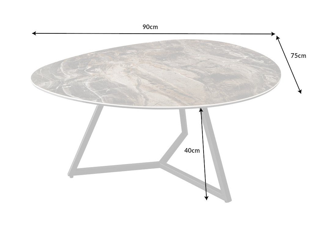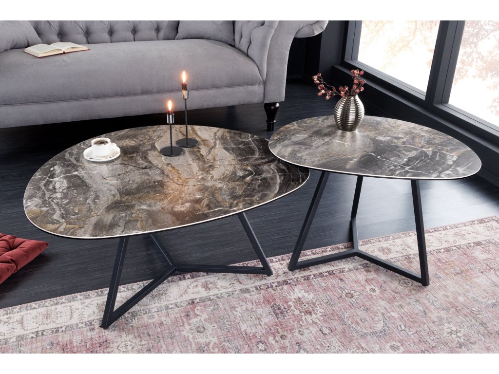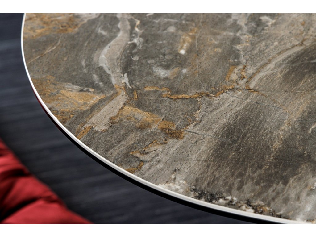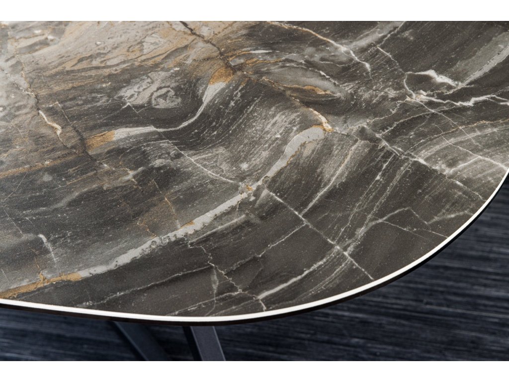 Konferenční stolek MORANO DARK zaujme výraznou keramickou deskou s tmavým mramorovým dekorem, jejíž bohatá kresba v odstínech šedé, hnědé a černé působí luxusně a přirozeně zároveň. Organický tvar desky změkčuje celkový vzhled a dodává stolku moderní lehkost.