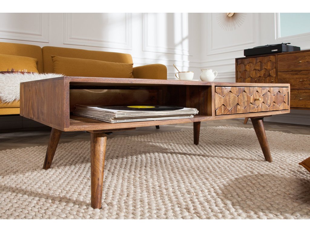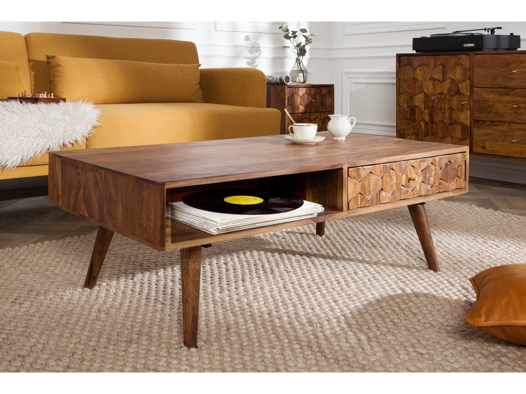 Konferenční stolek MYSTIC LIVING je vyroben z masivního sheeshamového dřeva, které vyniká výraznou kresbou, pevností a dlouhou životností. Dominantním prvkem stolku je dekorativní strukturované čelo zásuvek, které dodává nábytku osobitý a luxusní vzhled.