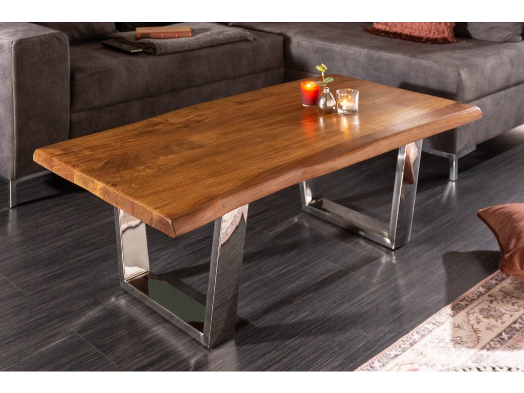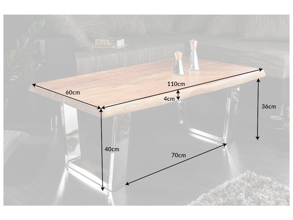 Tento konferenční stolek z masivního akátového dřeva je charakteristický výraznou kresbou a teplým hnědým odstínem, který dodává interiéru přirozenou atmosféru. Kombinace masivní dřevěné desky a stříbrných nerezových nohou působí elegantně a vyváženě. Díky ručnímu zpracování je každý kus originál. Robustní konstrukce a silná horní deska zajišťují stabilitu a dlouhou životnost, zatímco čisté linie umožňují snadné začlenění do moderních i přírodně laděných interiérů.