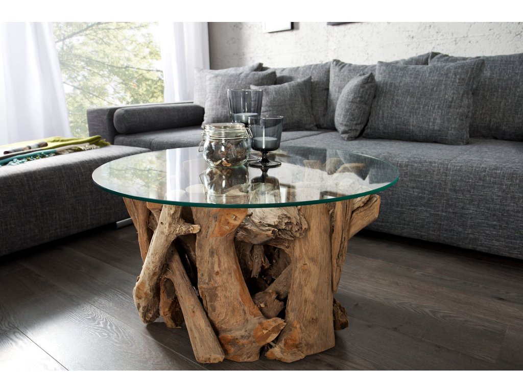 Konferenční stolek NATURE LOUNGE je vyroben z masivního teakového dřeva, které tvoří jedinečnou ručně skládanou základnu z přírodních kusů dřeva. Každý stolek je originál – kresba, struktura i tvar dřeva se mírně liší, což podtrhuje jeho autentický charakter.