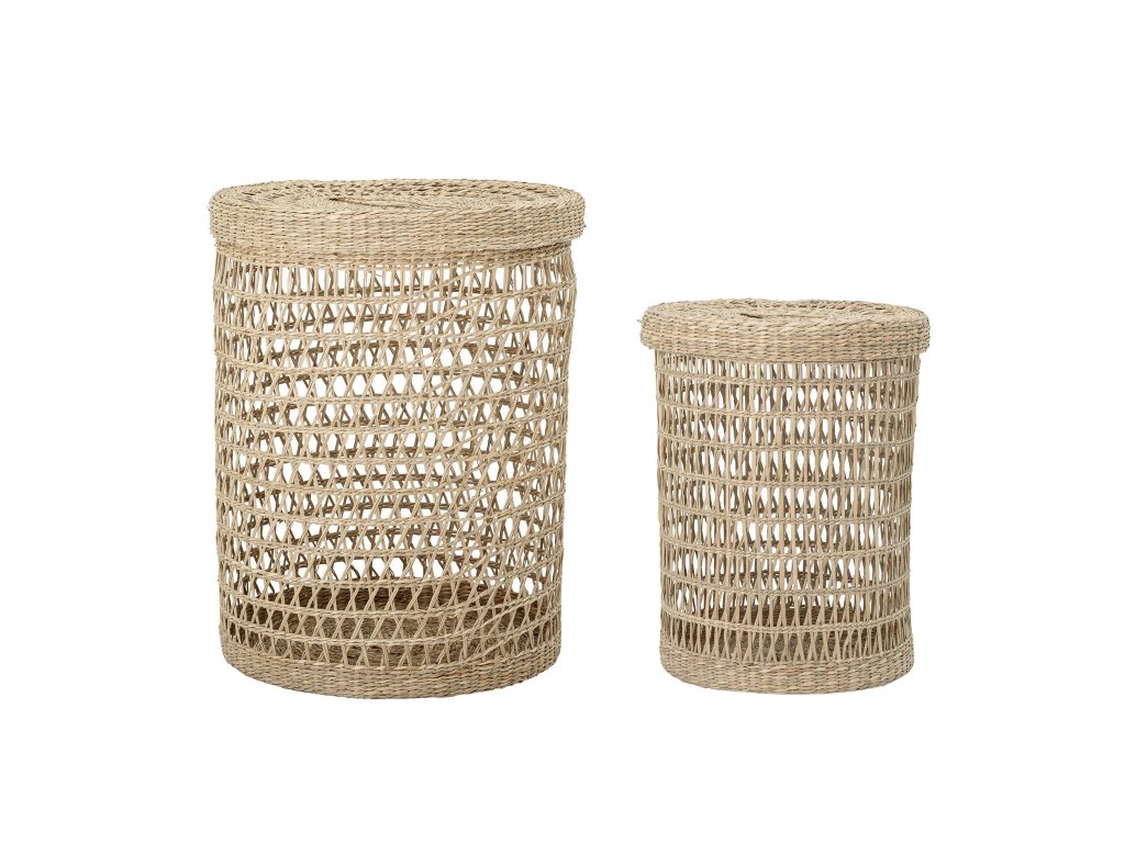 Sada 2 košů z mořské trávy, které lze použít k ukládání prádla, na háčky, role papíru - záleží na vás. Velikost 1: výška 40 cm průměr 31 cm. Velikost 2: výška 53 cm průměr 41 cm.Doplňkové parametry
