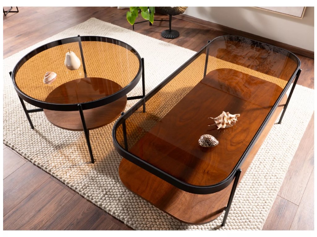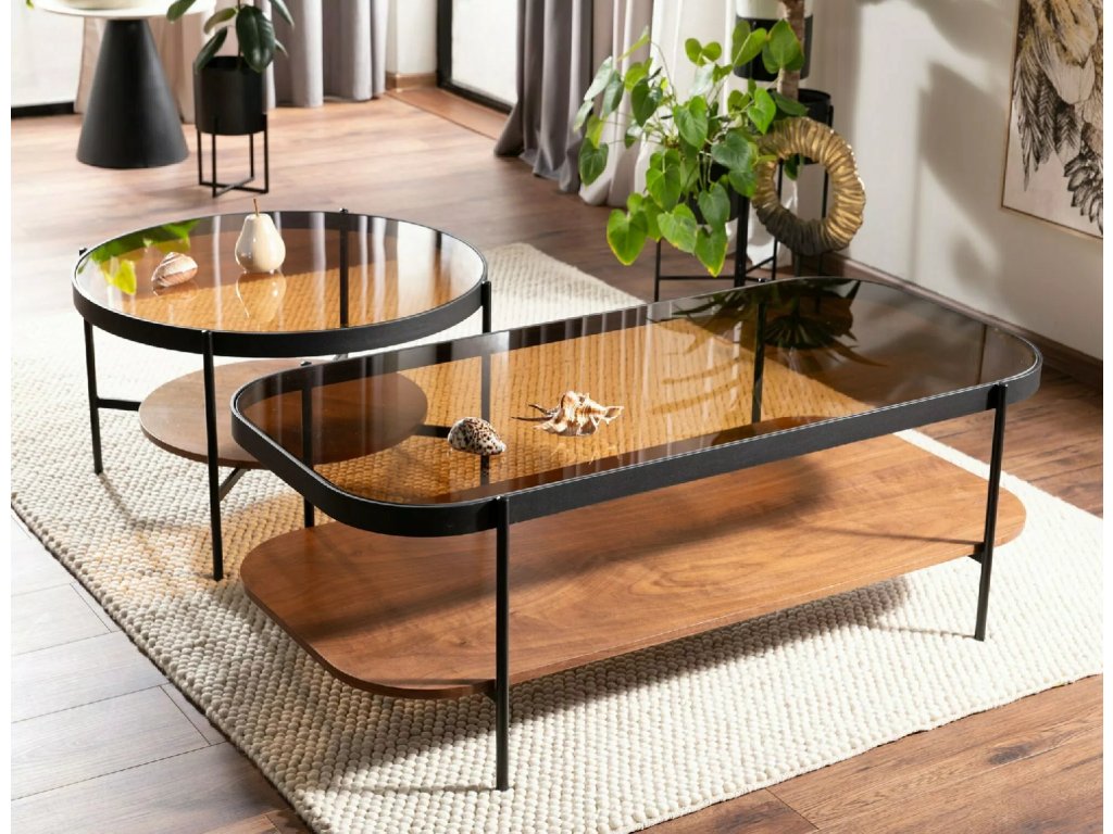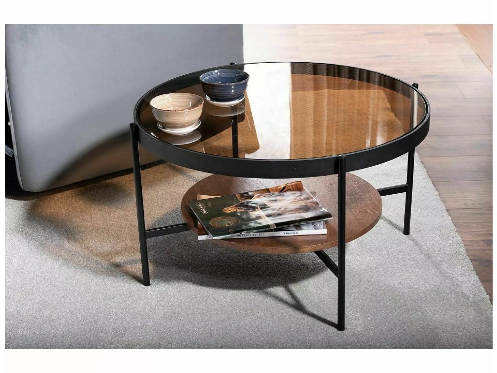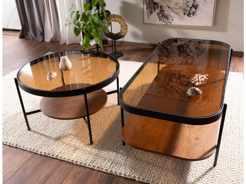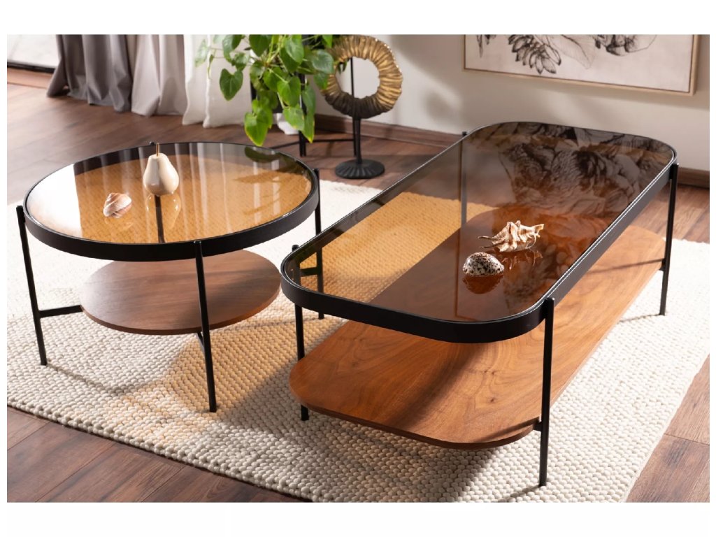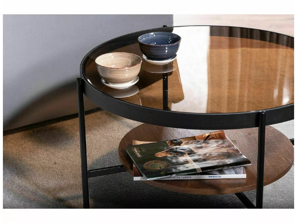 Konferenční stolek Prima B přináší moderní design v kombinaci s praktickým využitím. Kulatá skleněná deska v jantarovém tónu působí luxusně a vzdušně, zatímco spodní police z přírodní dýhy je ideálním místem pro odkládání časopisů, knih nebo drobností. Kovový rám v matné černé podtrhuje industriální charakter stolku.