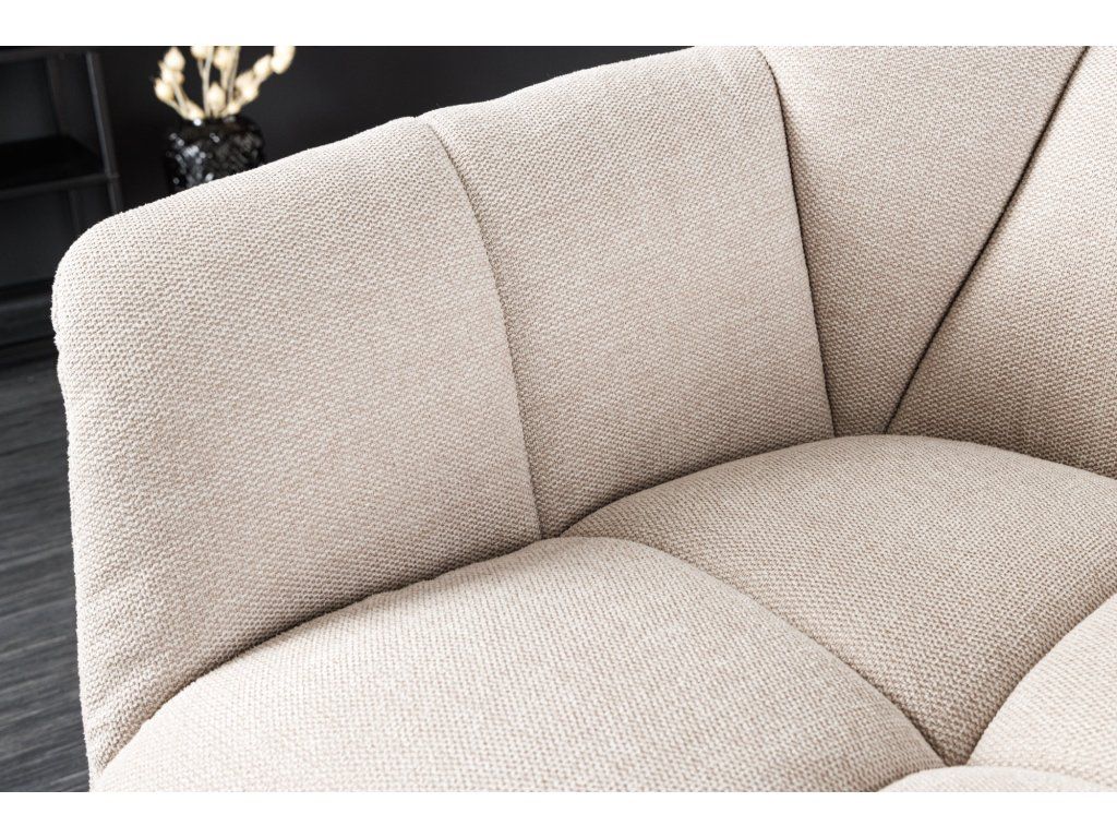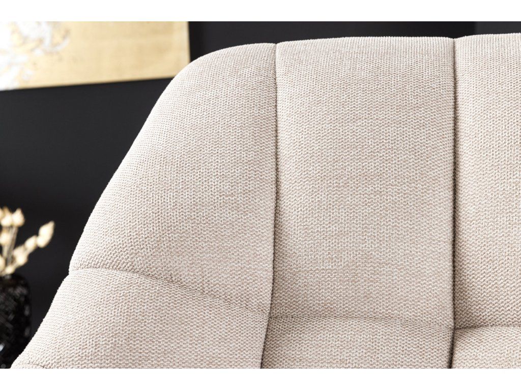 Designové otočné křeslo v béžovém provedení zaujme svým moderním tvarem a jemným prošíváním, které dodává celému kousku elegantní a nadčasový vzhled. Díky neutrální barvě se snadno kombinuje s ostatním nábytkem a hodí se do různých typů interiérů.