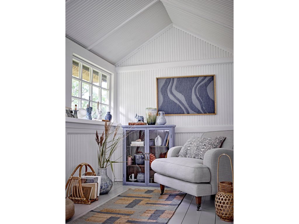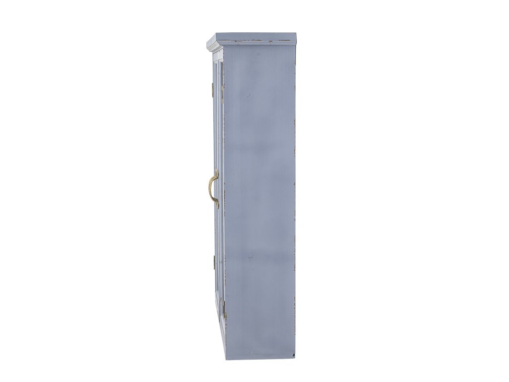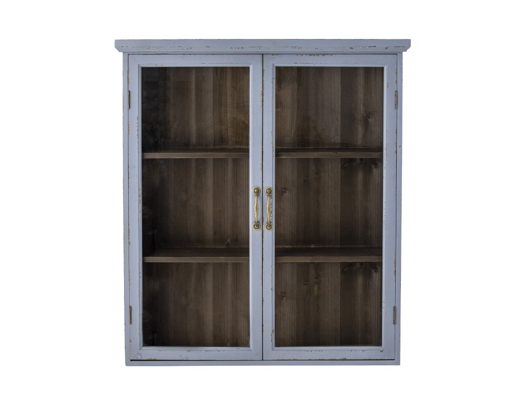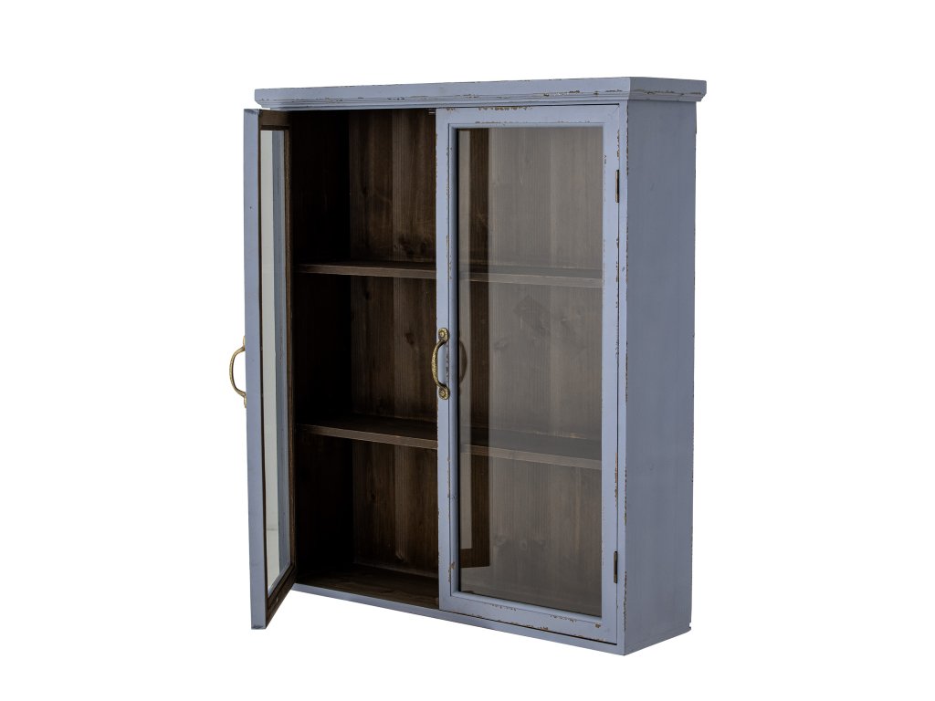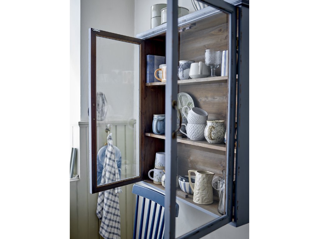 Skříňka Hazem od Creative Collection je dekorativní a praktická skříňka navržená v osobitém a okouzlujícím zašlém vzhledu v podmanivé hromově modré barvě. Díky proskleným dvířkům se skvěle hodí jako dekorace. Skvěle se hodí k ozvláštnění kuchyně, domácí kanceláře a obývacího pokoje.Doplňkové parametry
