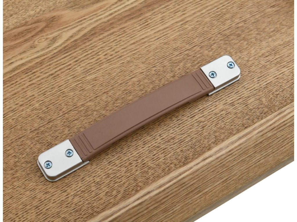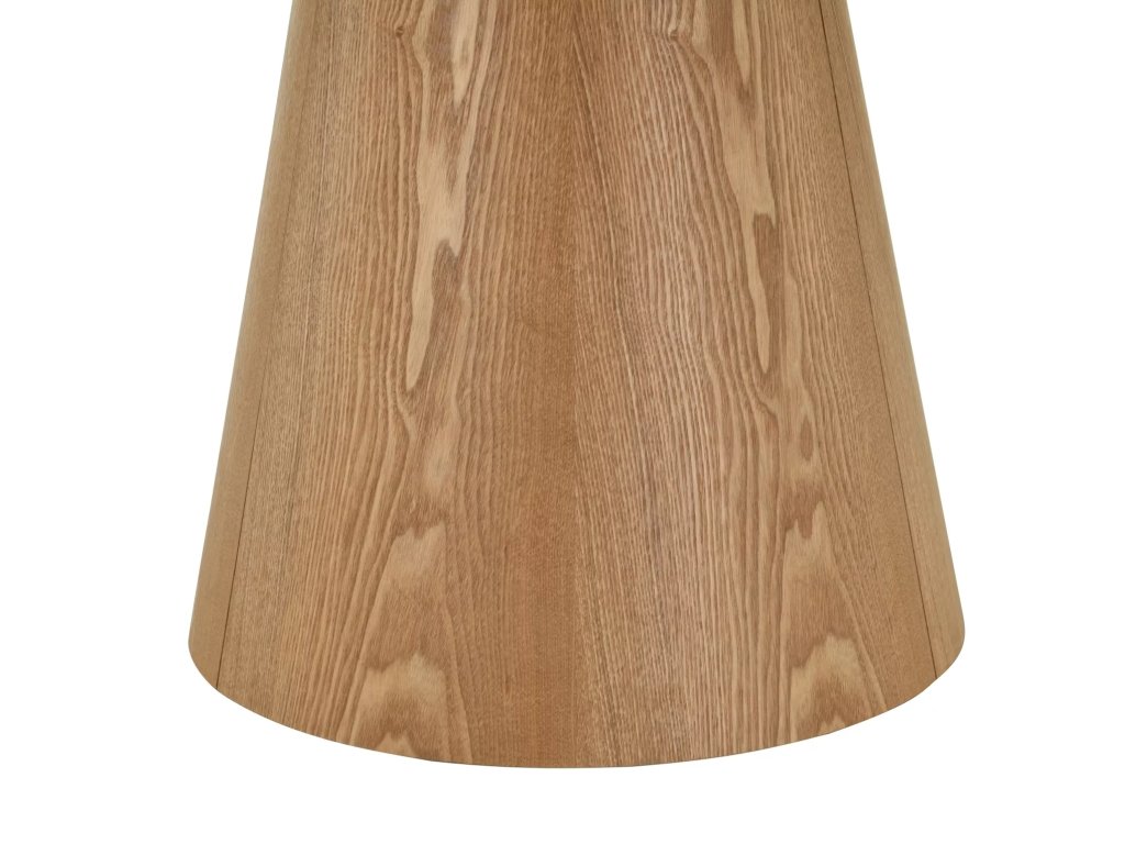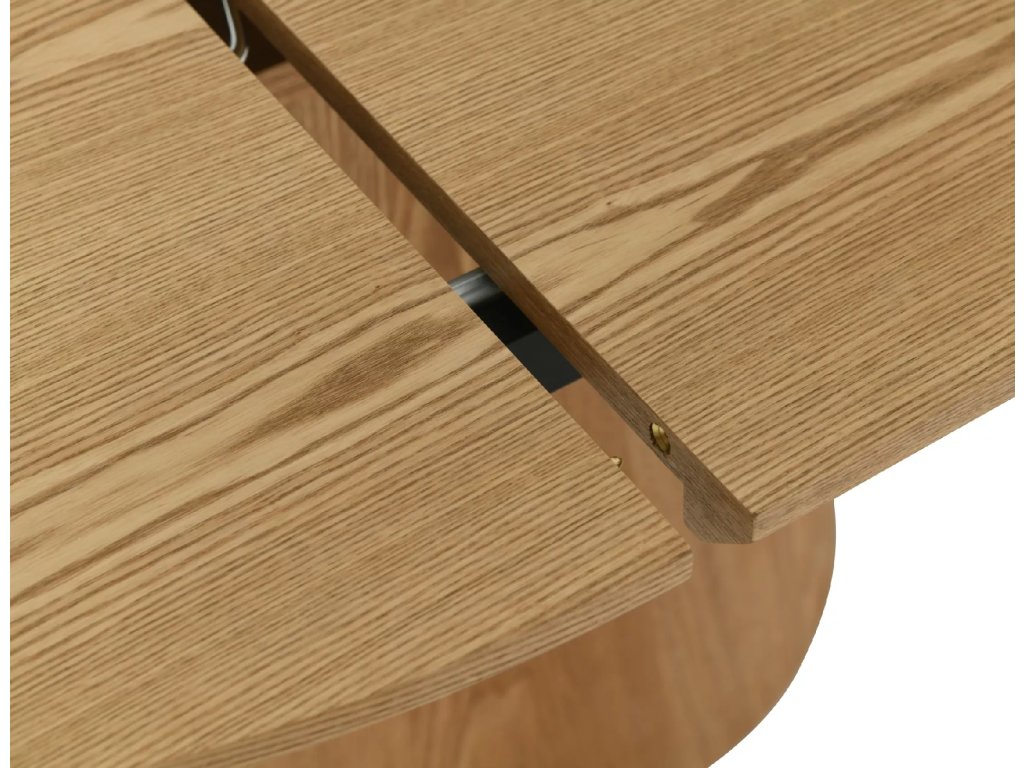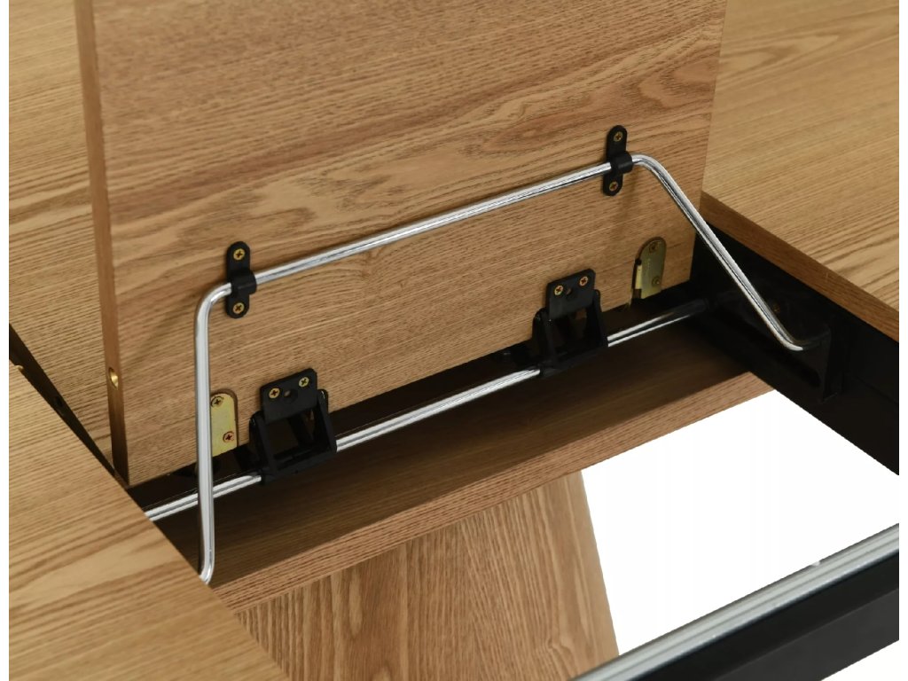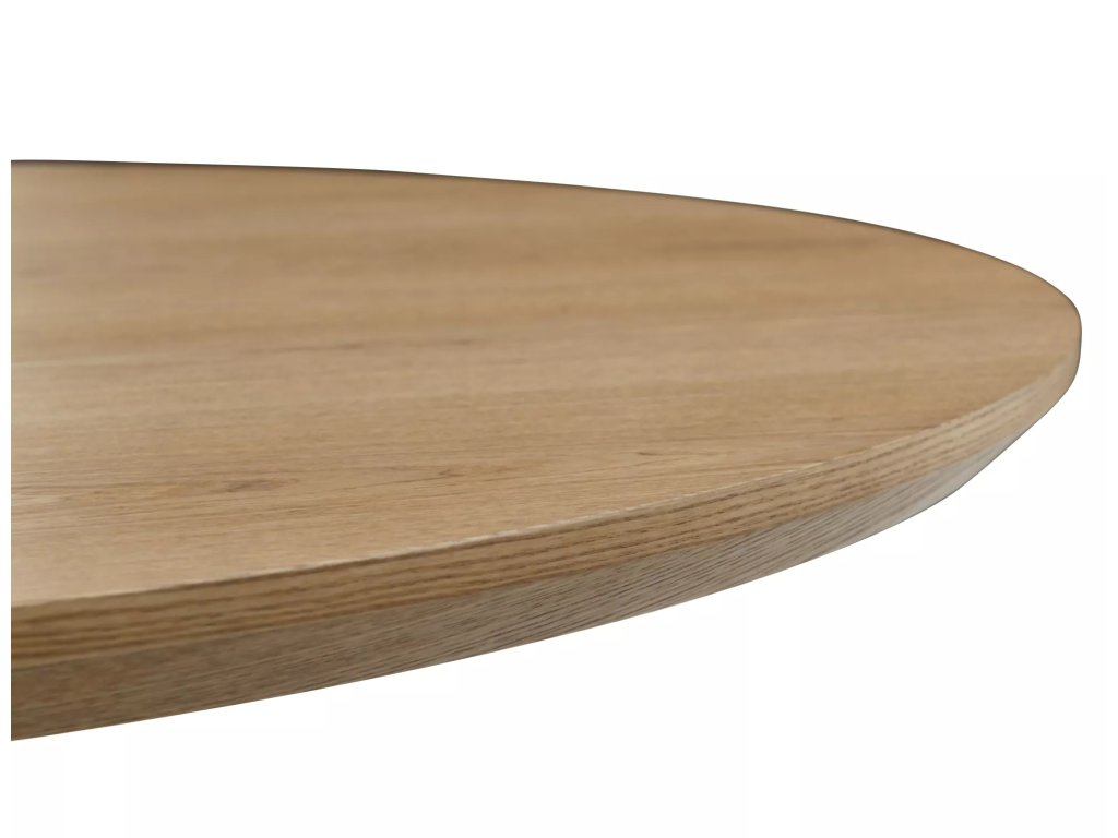 Celý stůl je vyroben z kombinace MDF a přírodní dubové dýhy, což zajišťuje vysokou pevnost, stabilitu a dlouhou životnost. Dominantním prvkem je masivní středová podnož, která dodává stolu jedinečný charakter a zaručuje pohodlné sezení bez překážejících rohů.