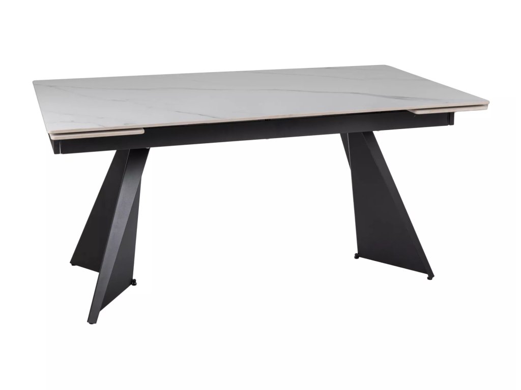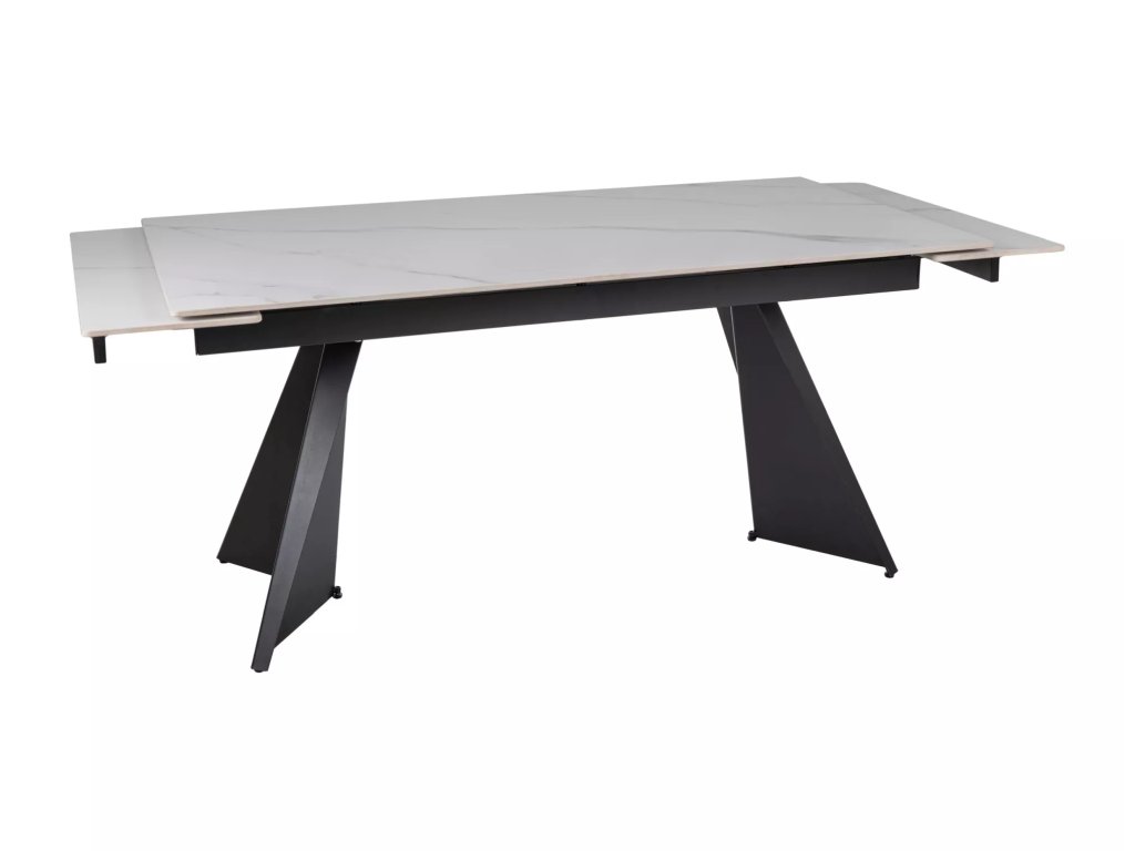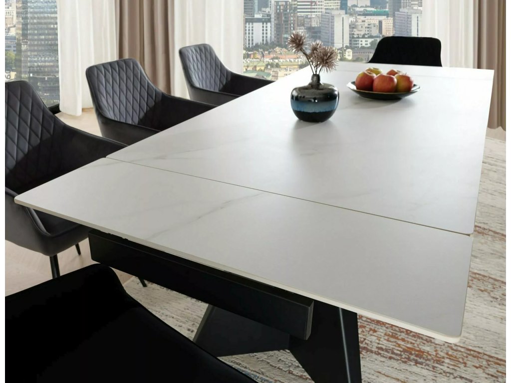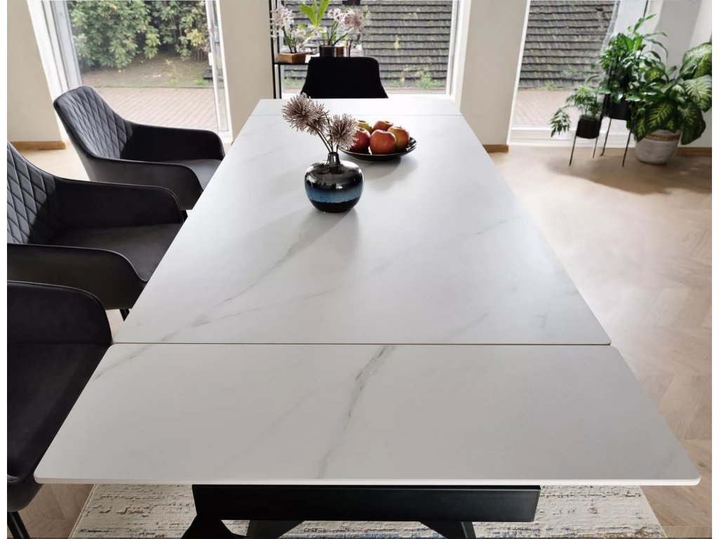 Deska z bílého keramického materiálu s jemnou kresbou mramoru působí luxusně a nadčasově, zatímco černá kovová konstrukce zaručuje vysokou stabilitu a kontrastní moderní vzhled.