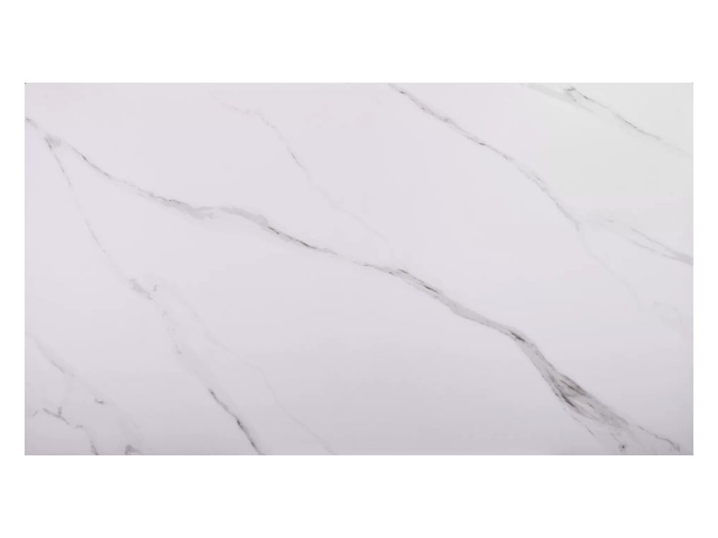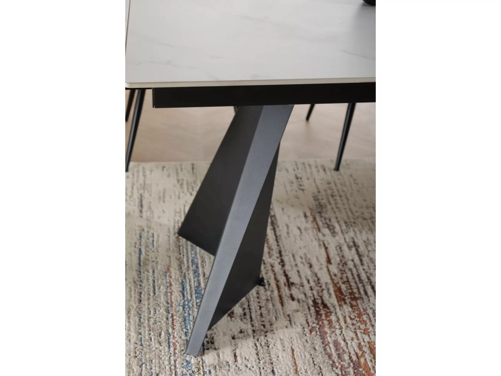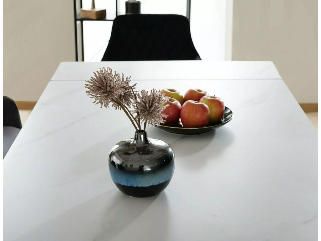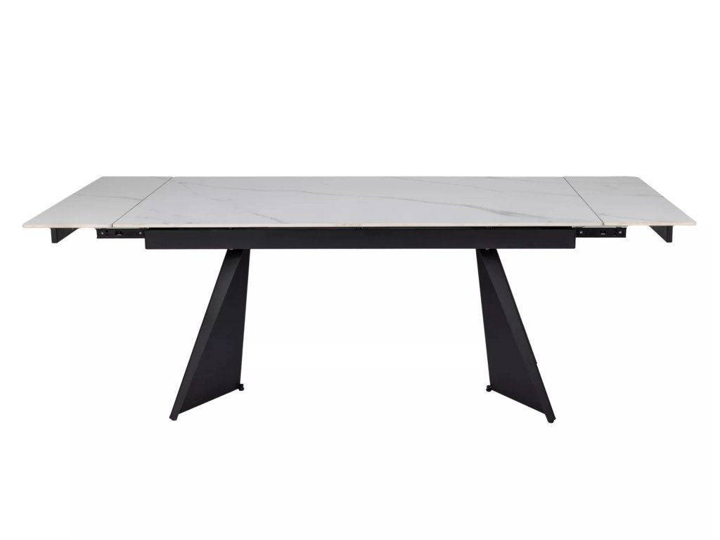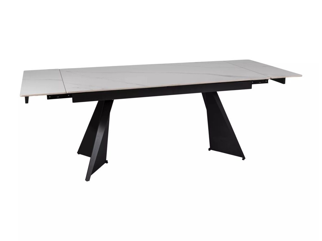 Deska z bílého keramického materiálu s jemnou kresbou mramoru působí luxusně a nadčasově, zatímco černá kovová konstrukce zaručuje vysokou stabilitu a kontrastní moderní vzhled.